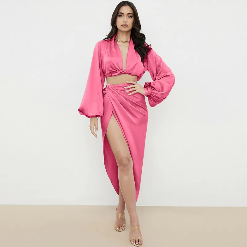 Kesiachiccly сатин из двух частей комплект Женский кроп топ с длинными рукавами на осень, топ с высоким длинные юбки с разрезом комплект из 2 предметов, пляжная одежда