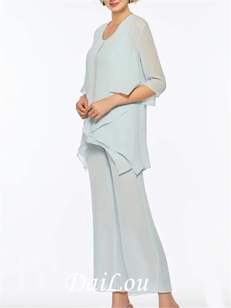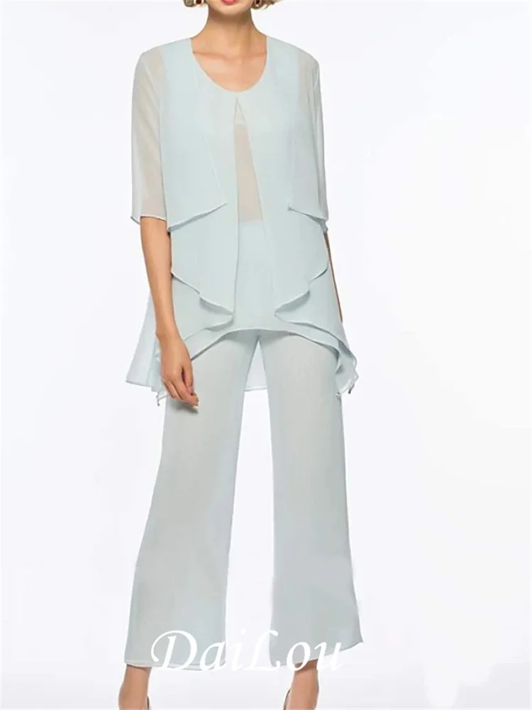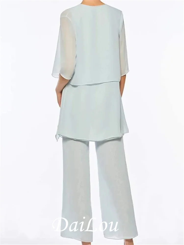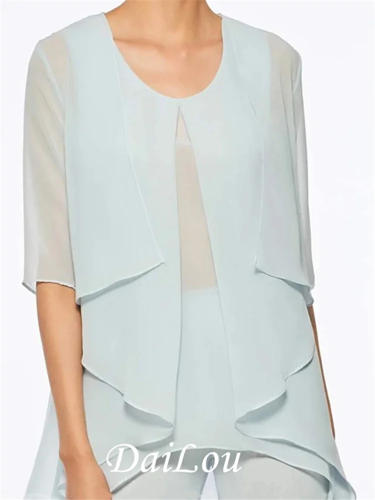 Элегантный шифоновый костюмкомбинезон для матери невесты, с драгоценным вырезом, длина в пол, рукав до локтя, со складками, 2021