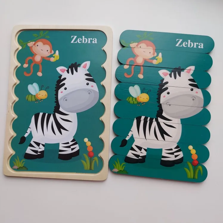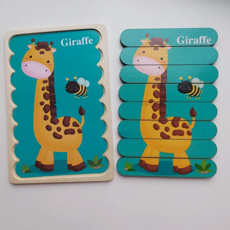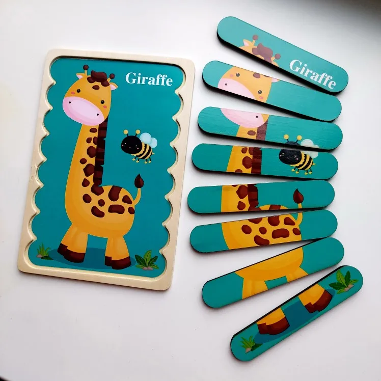 Детский деревянный 3D-пазл с животными, игрушка Монтессори, двухсторонний пазл с полосками, раскладываемая история, обучающая игрушка для детей