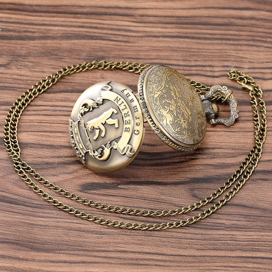 Часы карманные кварцевые с резным медведем, круглым циферблатом и цепочкой