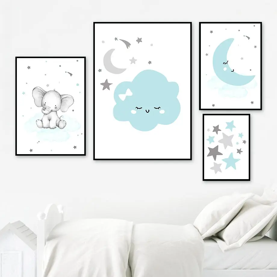 Постер на холсте с изображением слона, солнца, Луны, облака, звезды, художественная картина, голубые Мультяшные животные, художественные принты, скандинавские Детские Картины, декор для детской комнаты