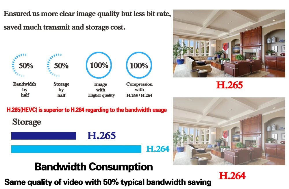 H.265 более четкий, HD разрешение предлагает вам лучшее качество изображения в более низкой скорости. Экономьте больше места для хранения, вы можете уменьшить размер файлов 40%-50%, сэкономить место для хранения HDD и снизить стоимость покупки.
