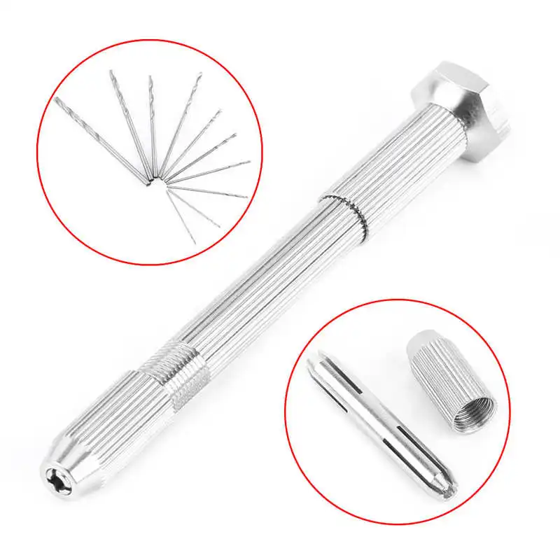 Ручная дрель полезна для точного сверления, создания инструмента, модельного сверла, гравировки в качестве профессиональной или хобби. ЭтоТочный, точный и эффективный, может использоваться для сверленияПечатная плата, ювелирные изделия, часыИ многие другие мягкие материалы, не могут сверлить сталь или камни. Поставляется десятьСверлаВРазныеРазмеры можно брать и использовать в различных целях.
