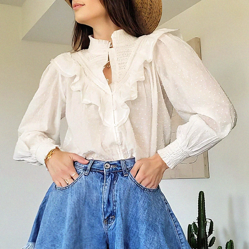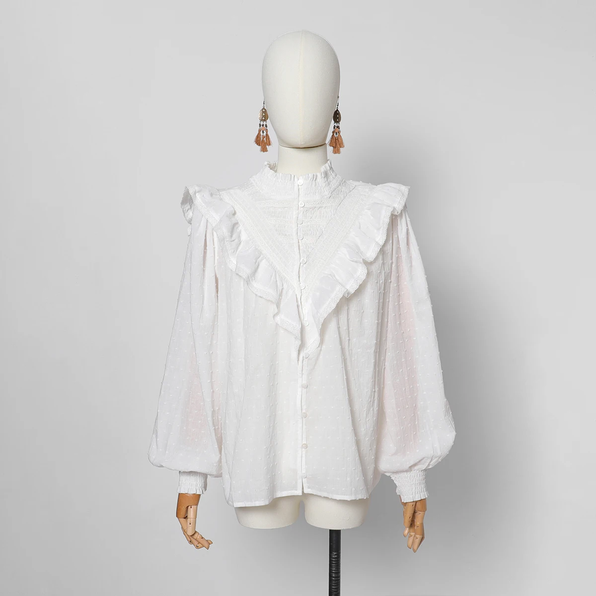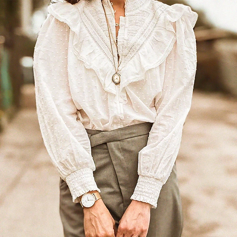 Белая блузка в стиле ретро, весна-осень 2022, рубашки с длинным рукавом и оборками, модная женская одежда, элегантные шикарные женские рубашки