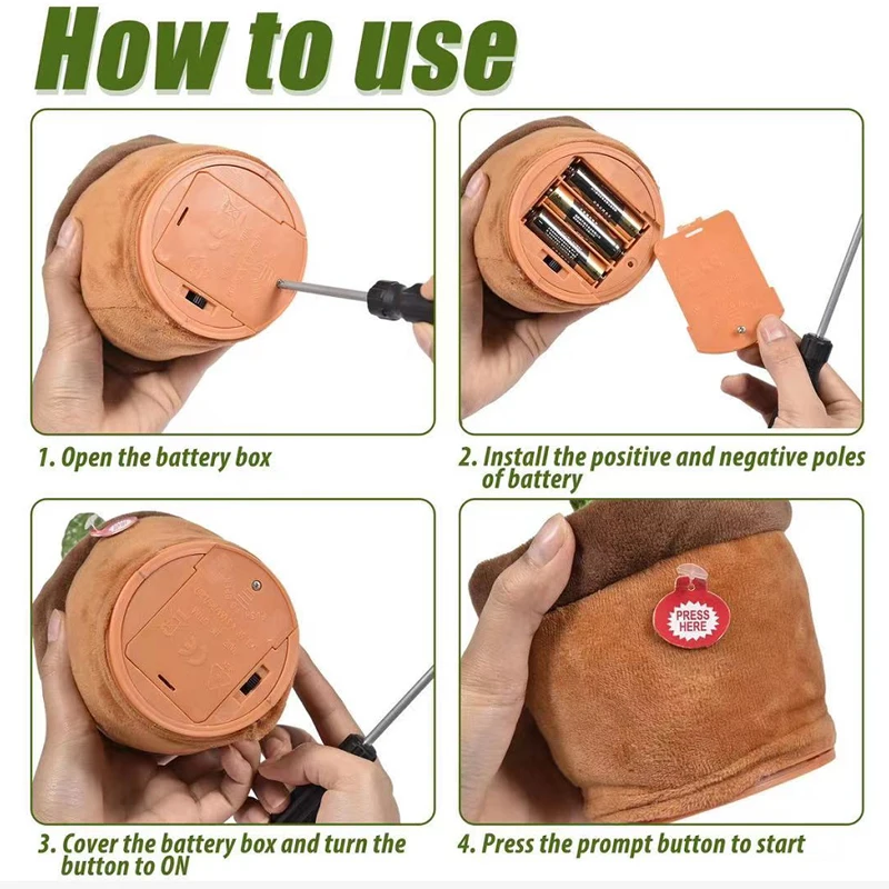 Особенности:1. Материал: игрушка-кактус использует ПП хлопковый наполнитель, который мягкий и удобный, безопасный и здоровый.2. Раннее Образование: хорошее для раннего образования. Игрушки будут прыгать с ритмом, который может привлечь внимание детей.3. Забавные игрушки: игрушки Содержат 60 или 120 английских песен, вы можете научиться говорить и танцевать в течение нескольких часов, что принесет детям жизнь счастливого времени.4. Лучший подарок: веселая музыка и танцы очень подходят для создания приятной атмосферы и для проведения вечеринок.5. Ежедневное техническое обслуживание: Не мойте в воде, избегайте высокой температуры и Остерегайтесь сильного давления.Функция:60 или 120 английских песен [запись + Освещение + танцы + обучение разговору]Характеристики:Размер: 32 смМатериал наполнения: полипропиленовый хлопокПесни: 60 или 120 английских песенВерсия батареи: 3 батарейки АА (не входят в комплект)Версия USB для зарядки: со встроенным аккумулятором