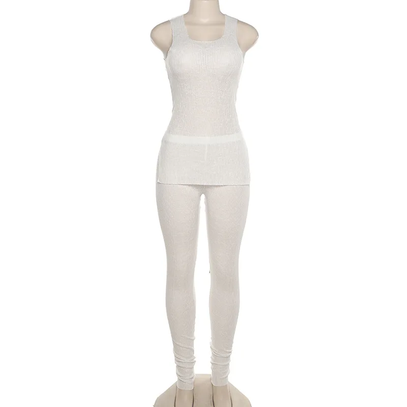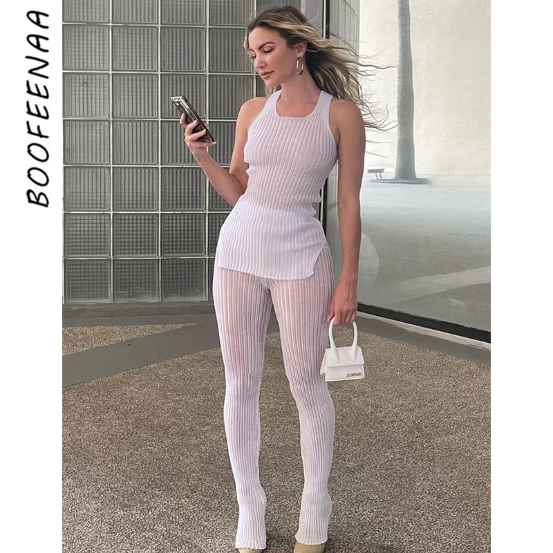BOOFEENAA сексуальный белый женский комплект 2 шт. Комплекты штанов облегающее в рубчик леггинсы комплекты со штанами женские прозрачные одинаковые комплекты C83-BI18