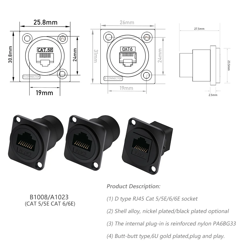 4 шт., разъем RJ45, CAT.6, CAT6A, тип D, 8P8C, металлический корпус + медные штифты, крепление панели шасси RJ45, гнездовой сетевой разъем