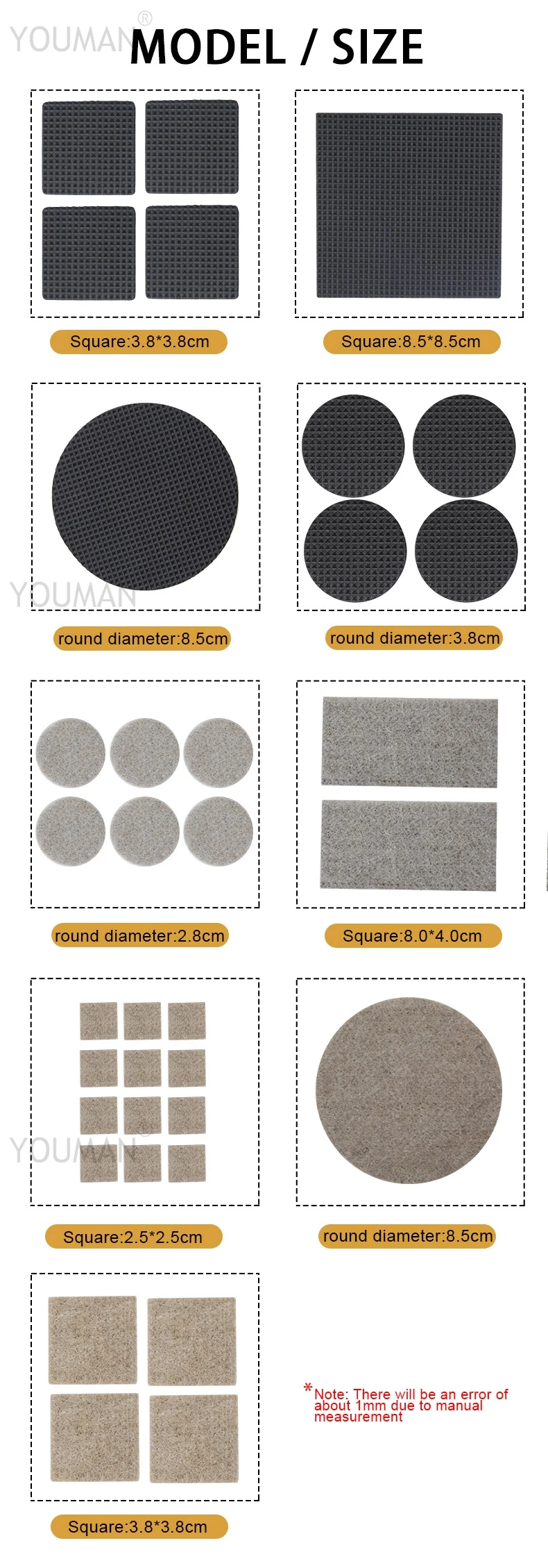 Диаметр 2,8 см/1,10 ''(войлок * 60 шт./упак.)Диаметр 8,5 см/3,34 ''(войлок * 10 шт./упак.)Размеры 3,8x3,8 см/1,49 ''(войлок * 40 шт./упак.)Размеры 2,5x2,5 см/0,98x0,98 ''(войлок * 90 шт./упак.)Размеры 8x4 см/3,14x1,50 ''(войлок * 20 шт./упак.)