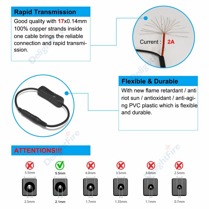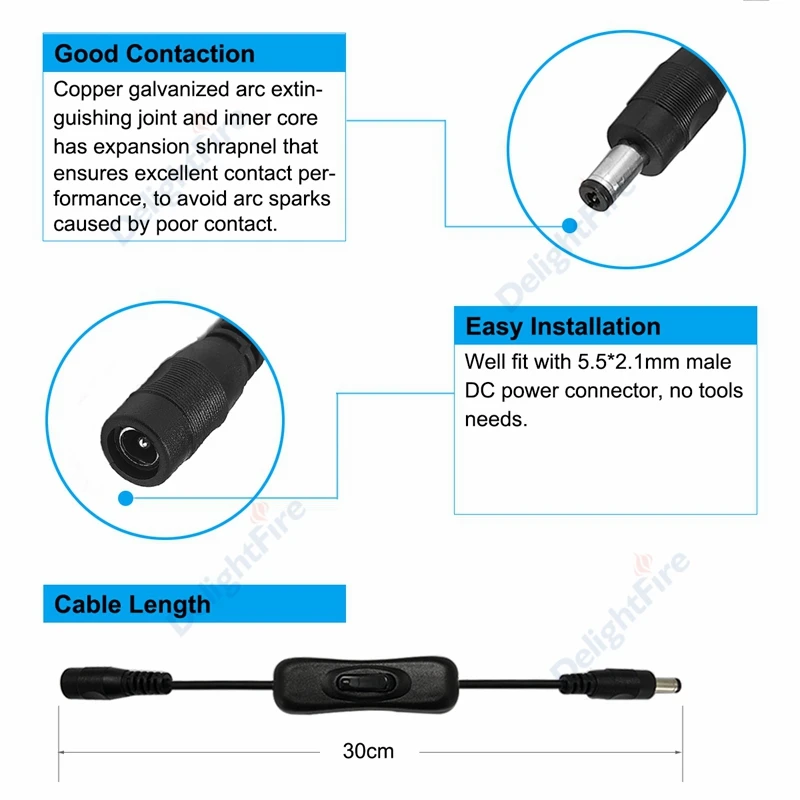 100% новый соединительный кабель выключатель питания постоянного тока Входное напряжение: DC5-24V Размер гнездового разъема: 5,5*2,1 мм Размер штекера: 5,5*2,1 мм Калибр кабеля: 22AWG Материал проводника: медь Изоляционный материал: ПВХ Рабочая температура:-10 °C ~ + 50 °C Длина кабеля: 30 смПосылка входит: