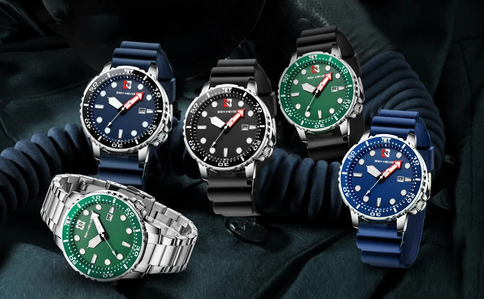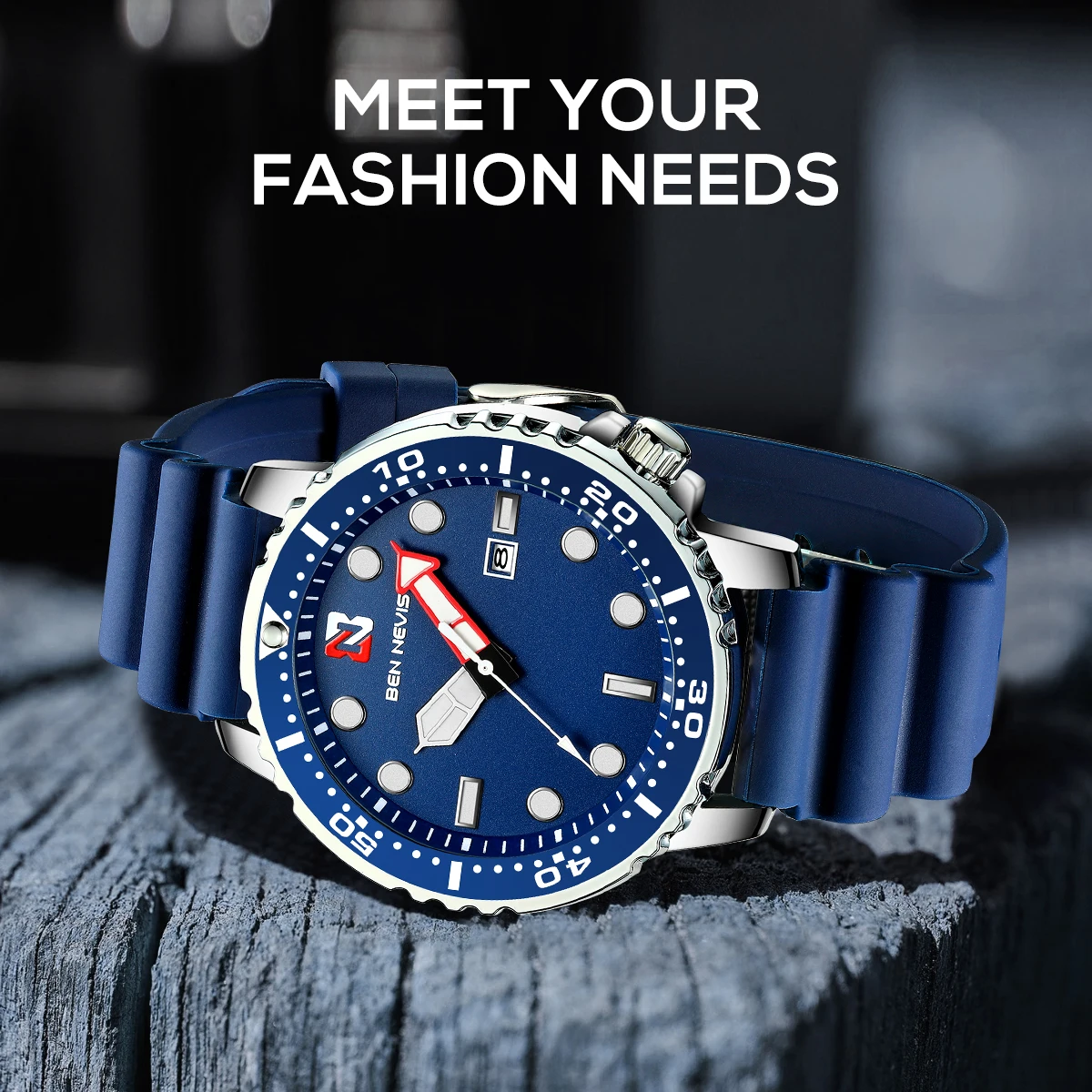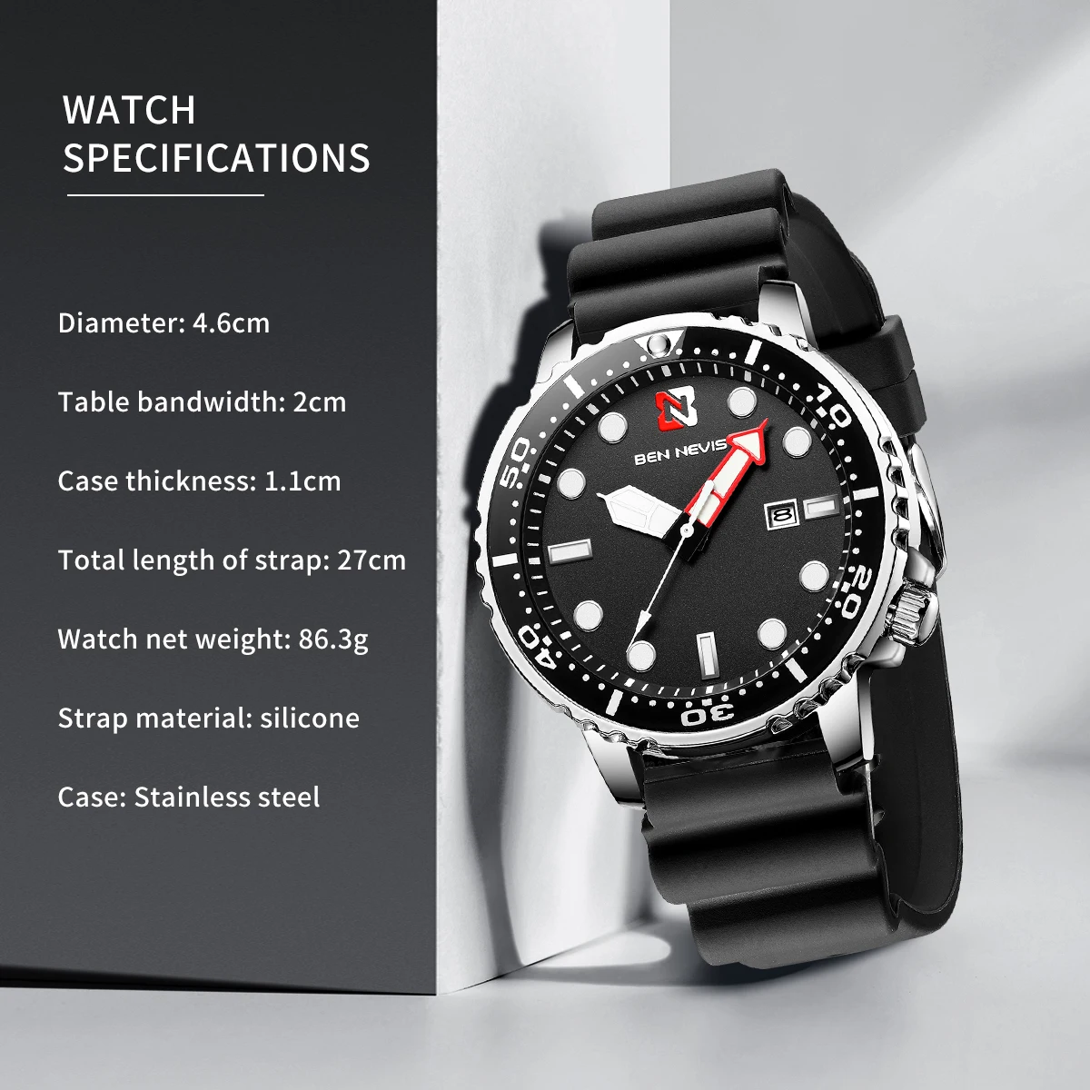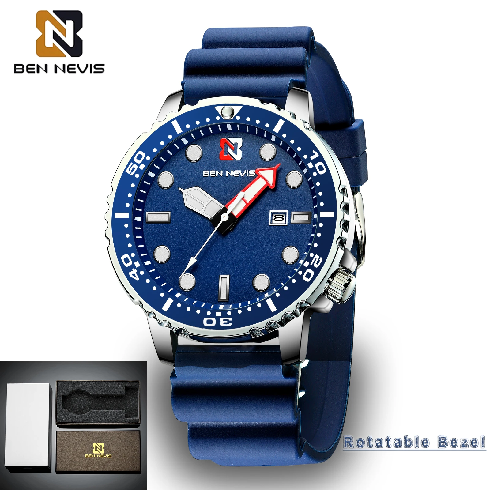 BENNEVIS новый бренд класса Люкс, Водонепроницаемый часы Мужские кварцевые Резиновые модные часы вращающийся ободок световой Дата relogio masculino