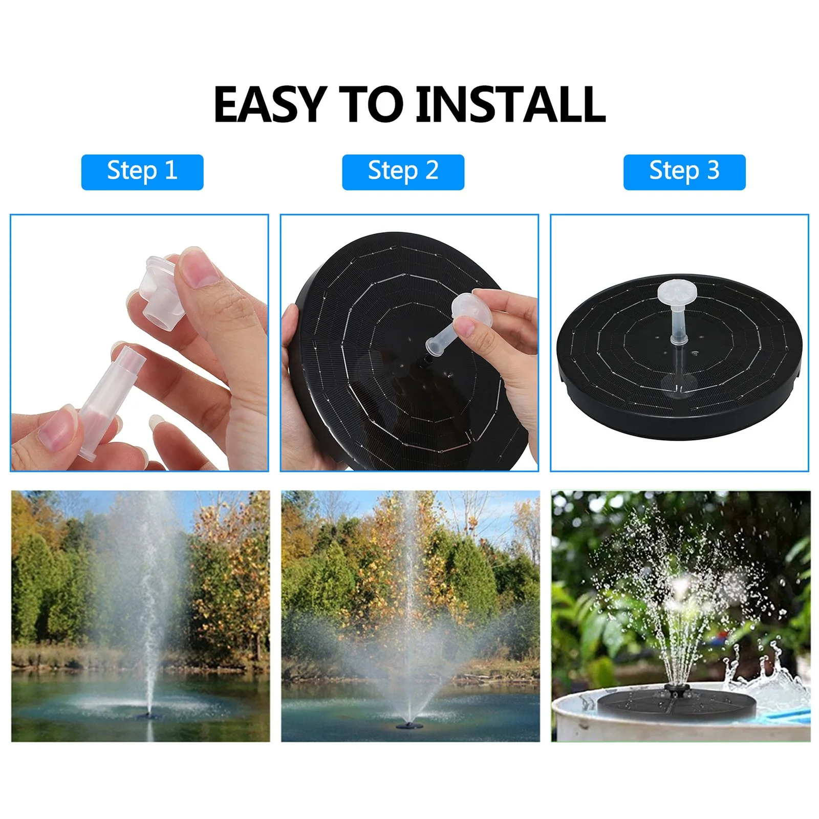 【Простота использования 】: Соберите разные насадки по своему усмотрению и поместите этот солнечный фонтан для птичьей ванны в воду, насос начнет работать при достаточном солнечном свете. Идеально подходит для ванны для птиц, небольшого пруда, аквариума, бассейна, украшения сада, циркуляции воды для кислорода.