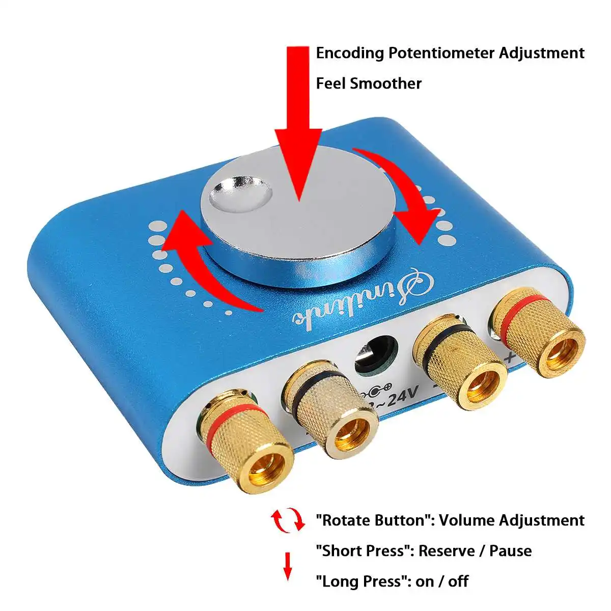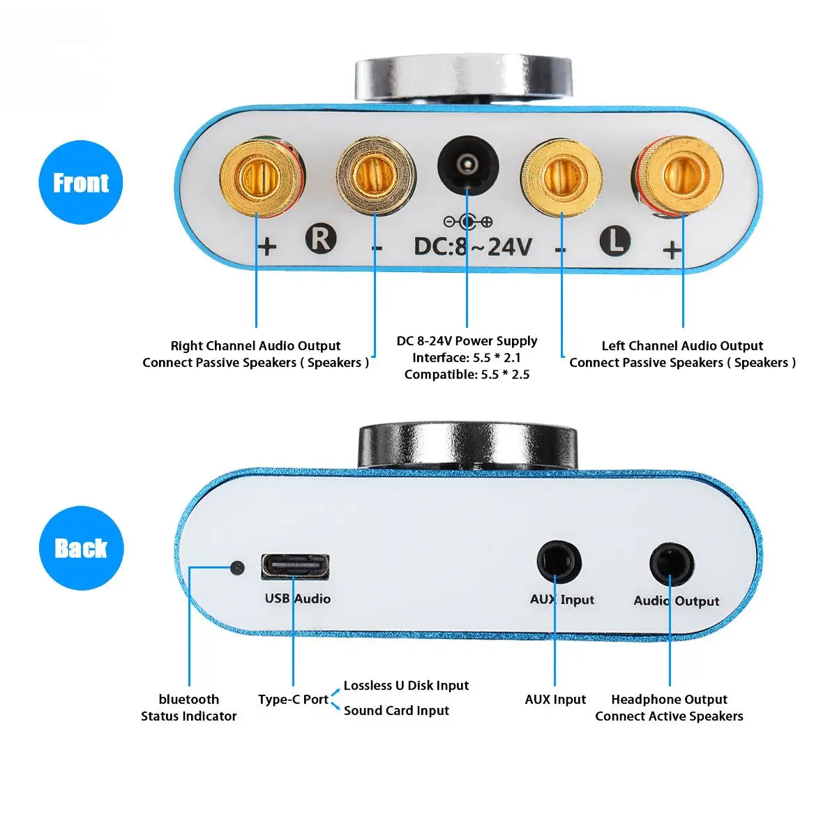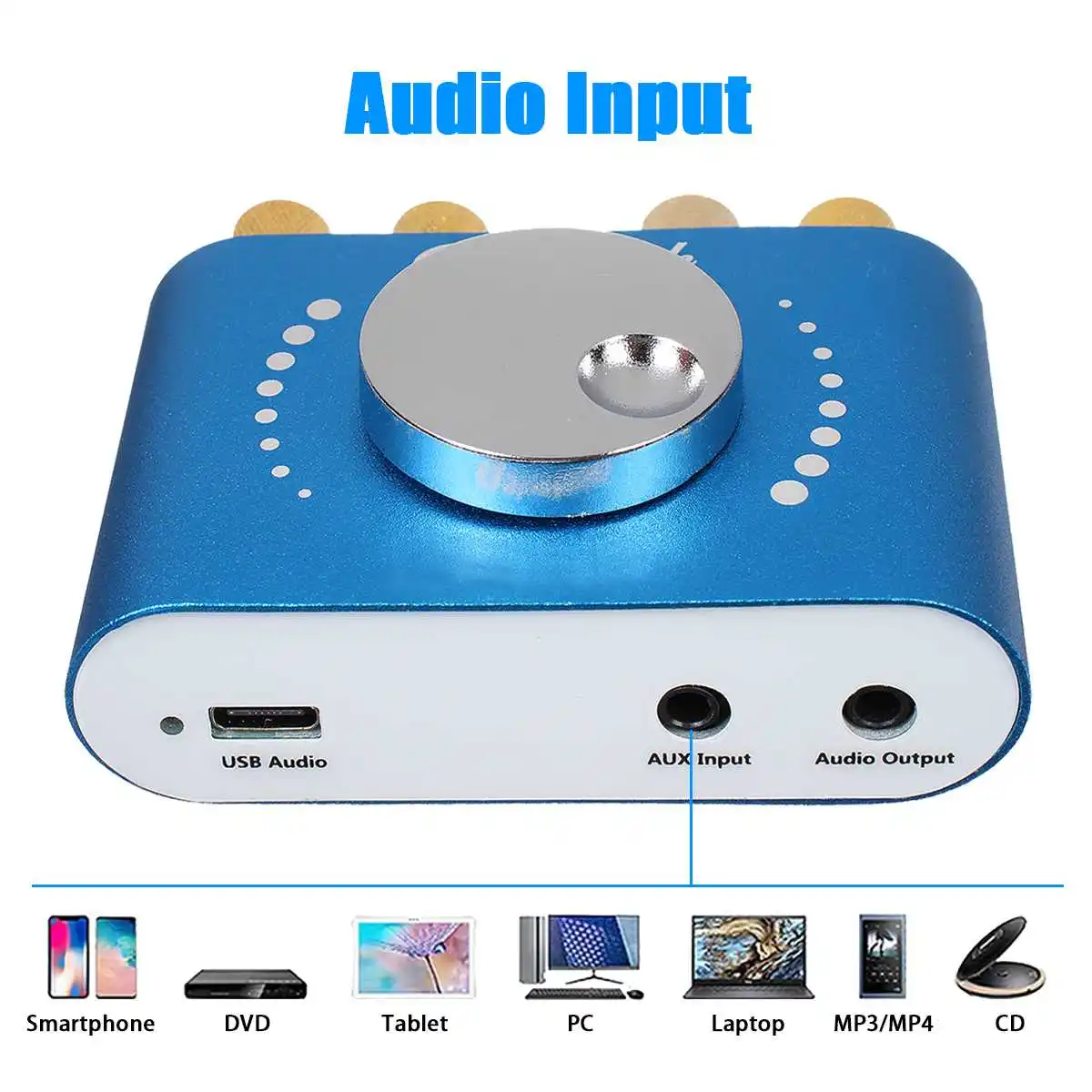 Особенности:-Мини HIFI Цифровой bluetooth аудио усилитель мощности.-Подходит для U диска, AUX входа, MP3 формата воспроизведения, поддержка bluetooth беспроводного подключения.-Два выхода основного канала, выходы левого и правого каналов являются интерфейсами для динамиков.-Устройство поддерживает работу bluetooth и поддерживает линейный вход.