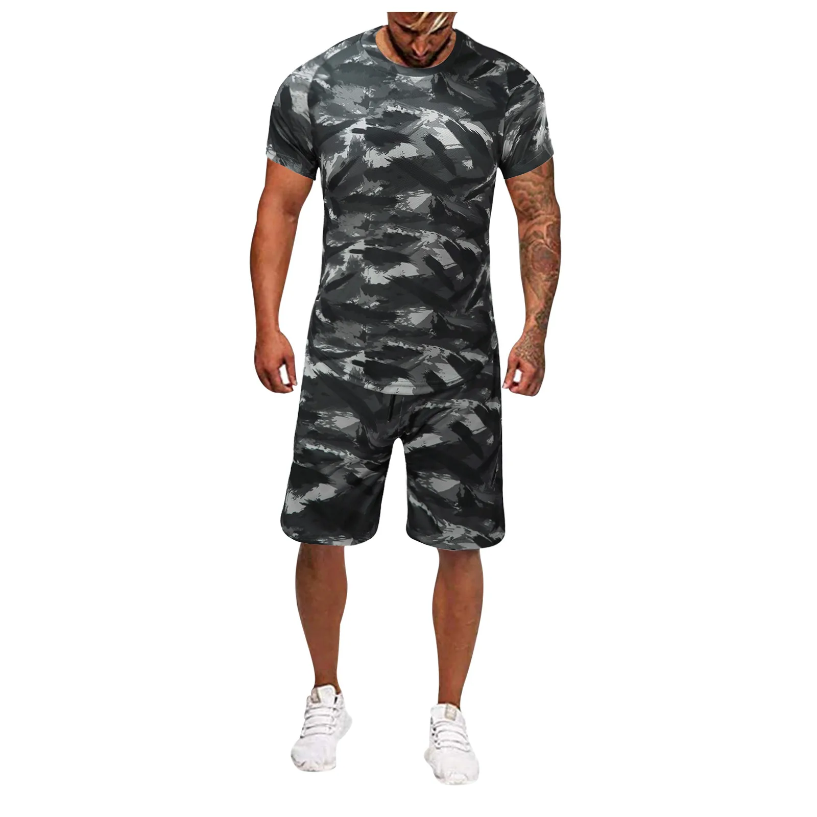 Комплект одежды для мужчин из 2 предметов, лето 2021, мужские топы с камуфляжным принтом и круглым вырезом и шорты с кулиской, наряд, модные спортивные повседневные Костюмы
