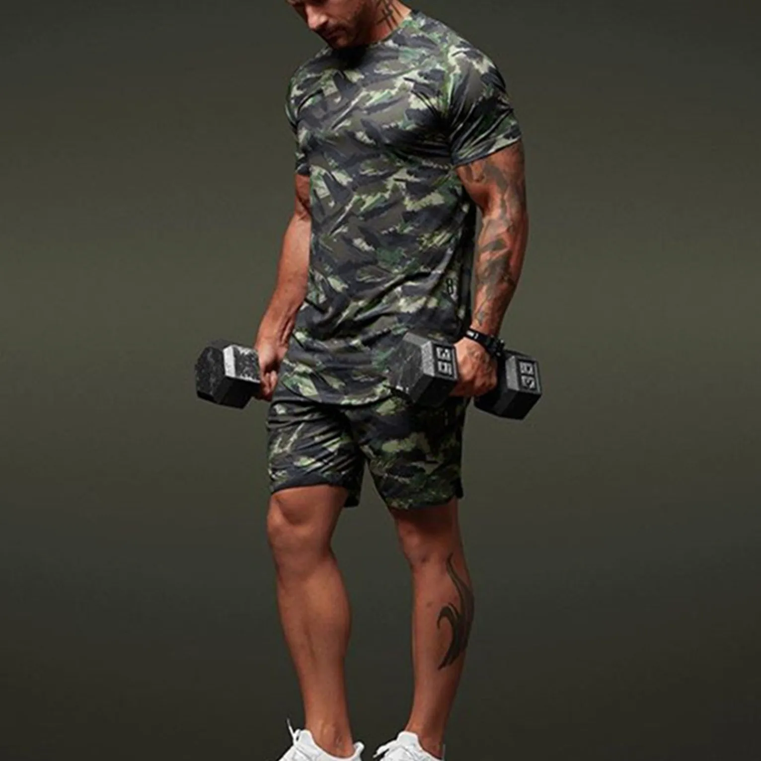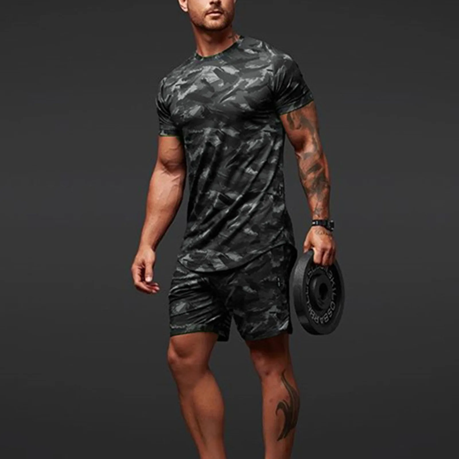 Мужской Камуфляжный облегающий Быстросохнущий комплект для фитнеса с короткими рукавами и шортами