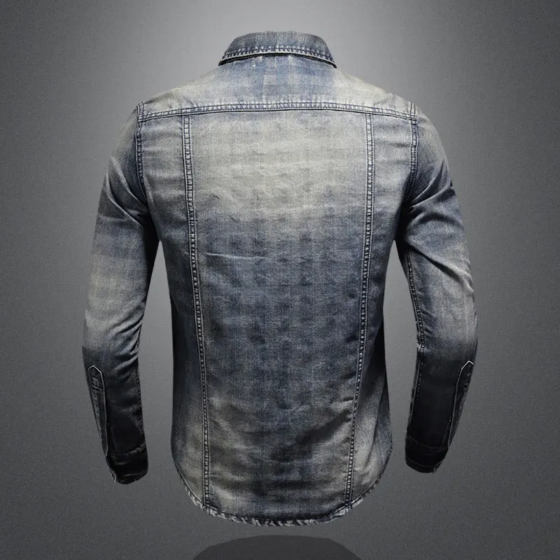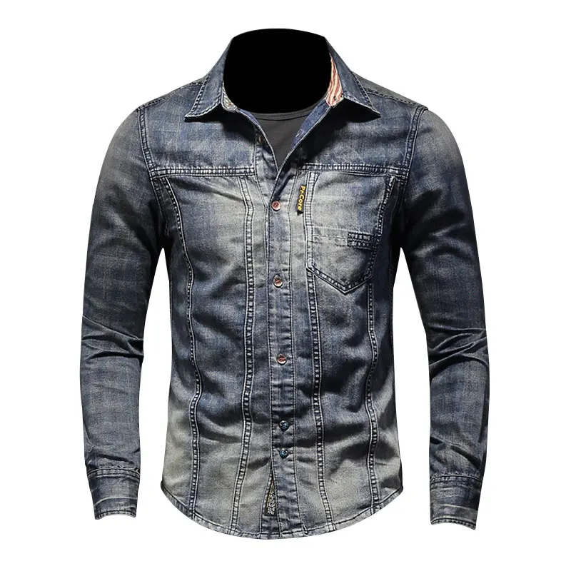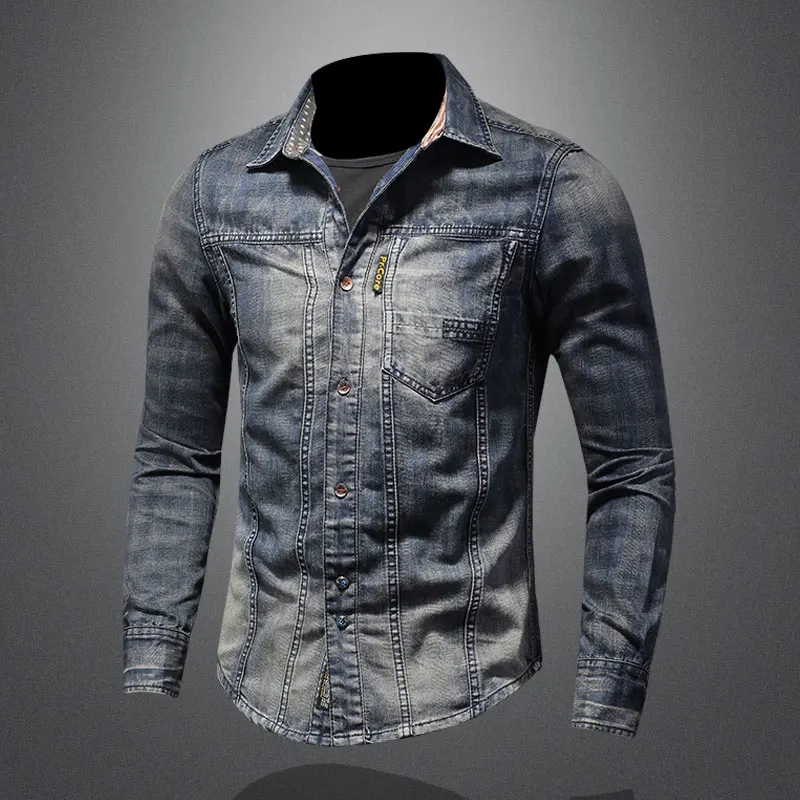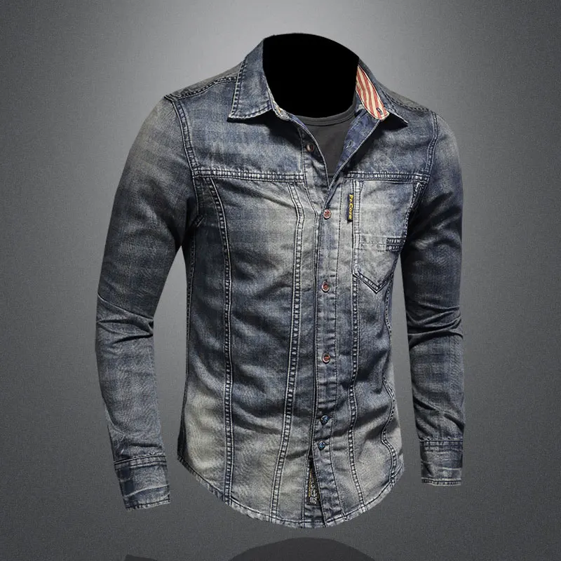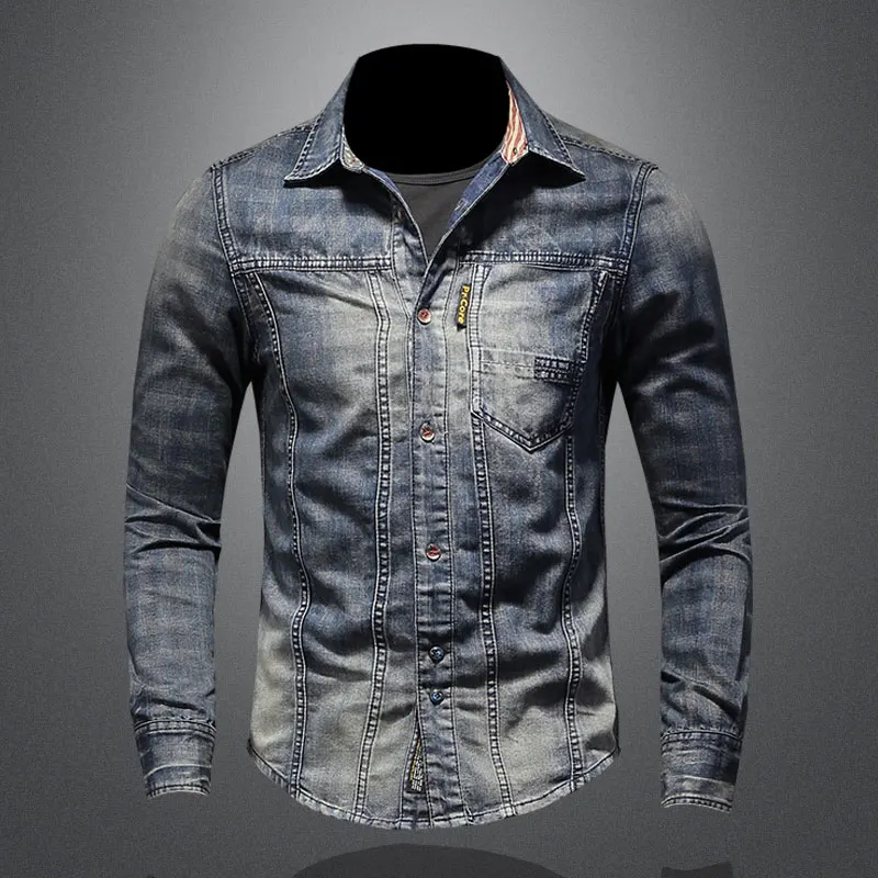 2021 ретро джинсовые рубашки мужские Джинсовые рубашки Slim с длинным рукавом и стоячим воротником в клетку с принтом в байкерском стиле в уличном стиле для отдыха; Тонкое пальто