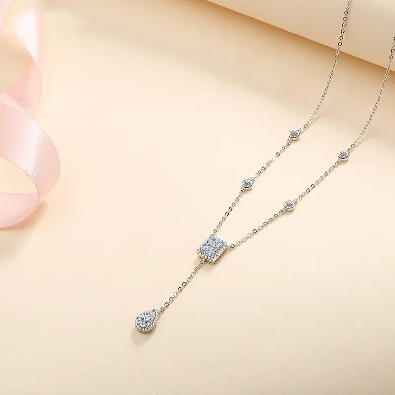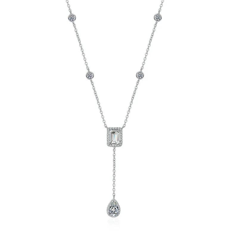 Цепочка с подвеской Goeki, из серебра 925 пробы, с кристаллами 3 карата D, VVS1, в форме капли воды, прямоугольная, с муассанитом