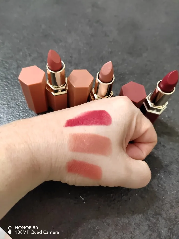 1. Тонкий золотой блеск втирается в матовую бархатную текстуру, и он имеет высокий уровень сладости ~2. Тепло и мягкость молочного чая обертывает губы с туманным эффектом3. Бархатная глазурь для губ добавляется с высококачественными тонкими вспышками, как великолепное украшение бриллиантами на бархатном платье4. Хорошая адгезия, яркие цвета могут храниться в течение длительного времени5. Высокая концентрация цветового фактора, подчеркивает трехмерную губу