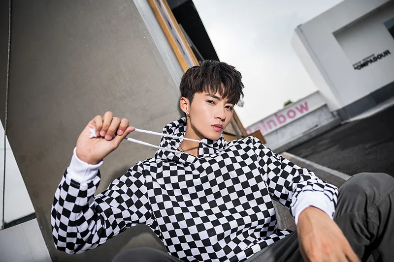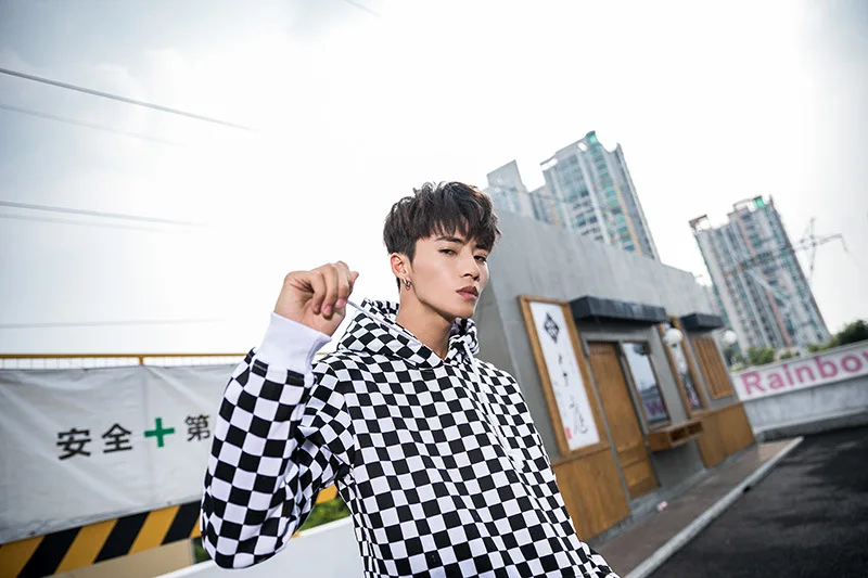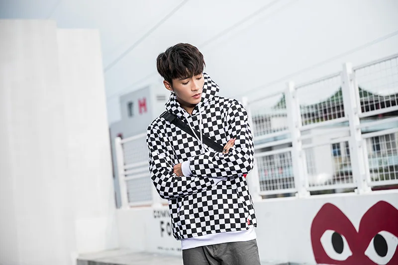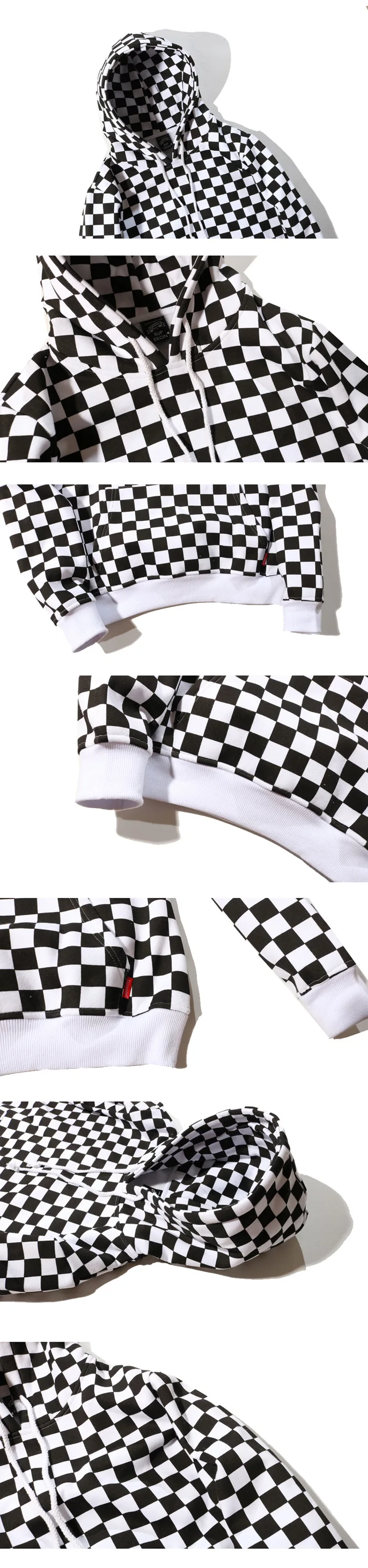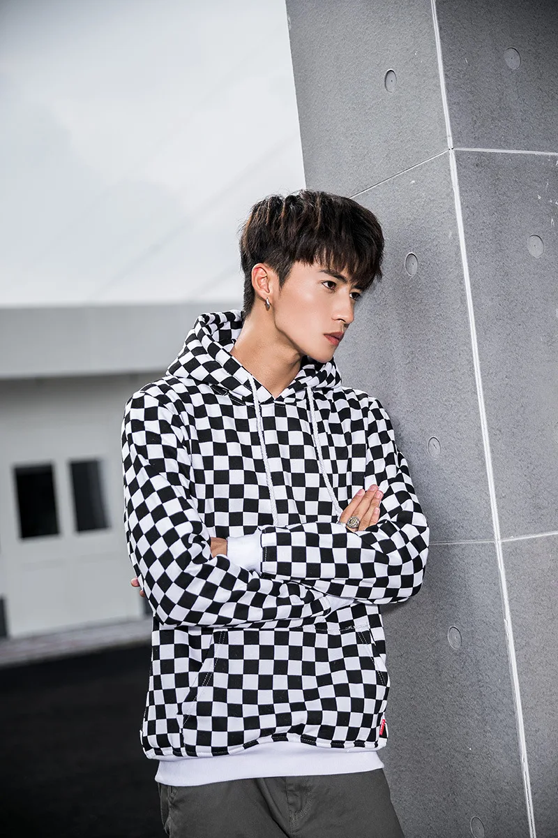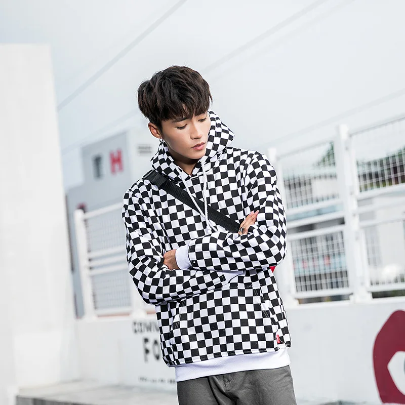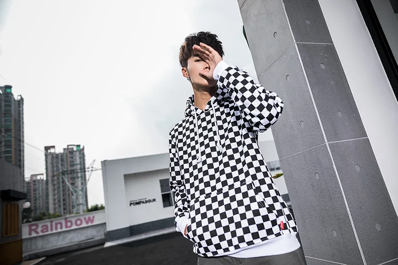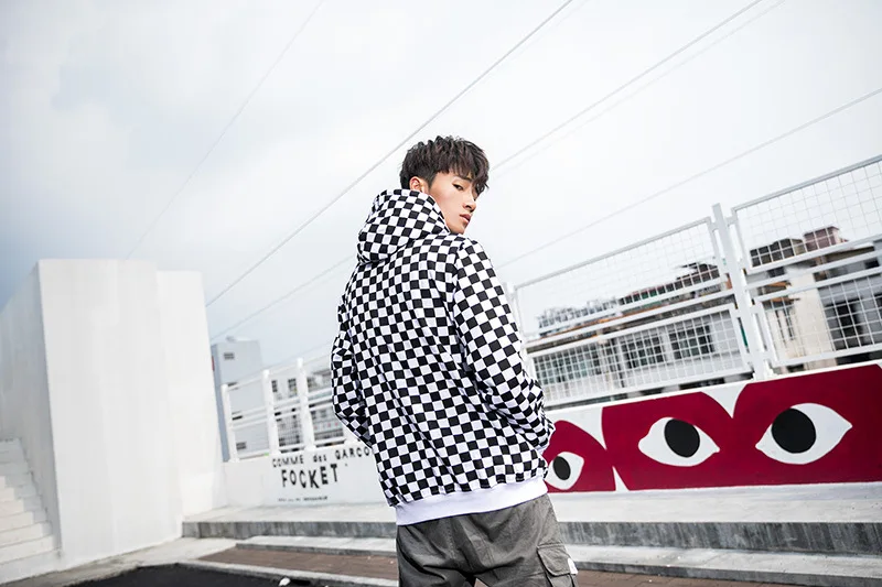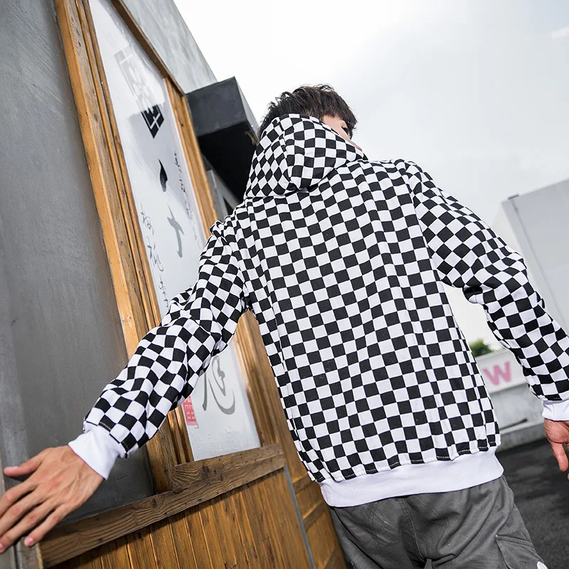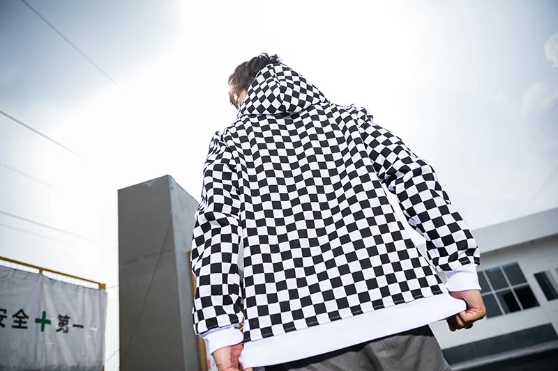 Мужской пуловер в клетку, черно-белый свитшот в стиле хип-хоп, уличная одежда в шахматную клетку для пар, флисовый хипстерский пуловер оверсайз с капюшоном, 2021