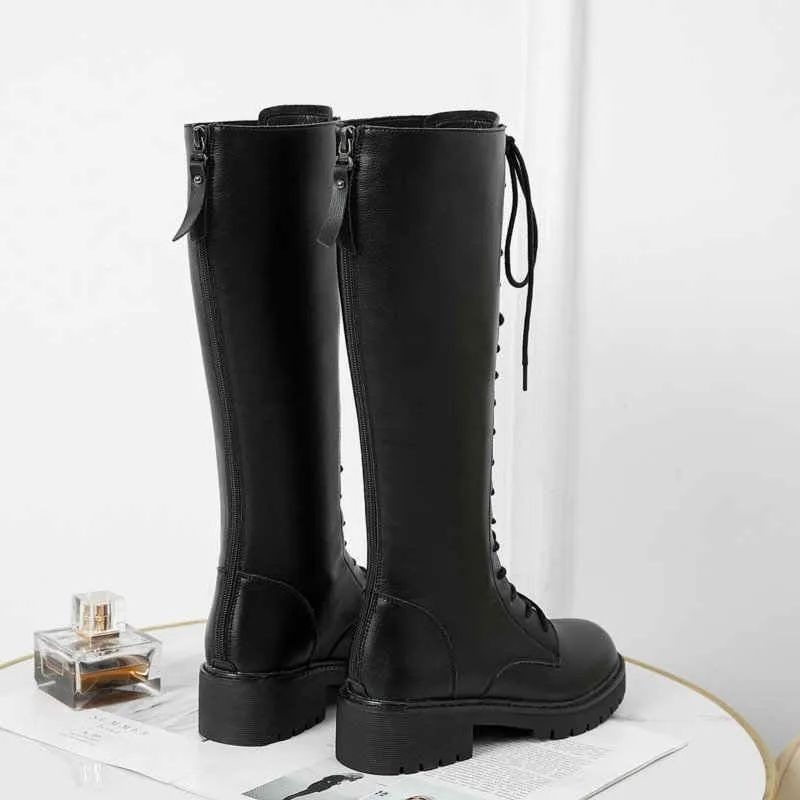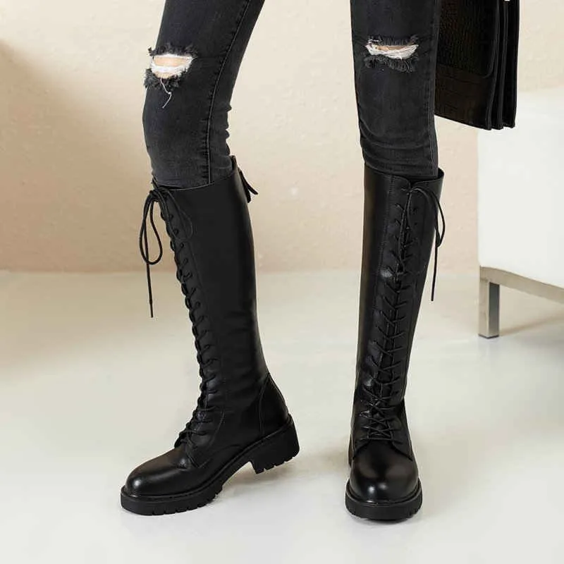 Женские сапоги до колена с плюшевой подкладкой, черные кожаные боевые сапоги в стиле панк, готическая обувь, женские теплые длинные сапоги на толстой подошве с мехом, зима 2021