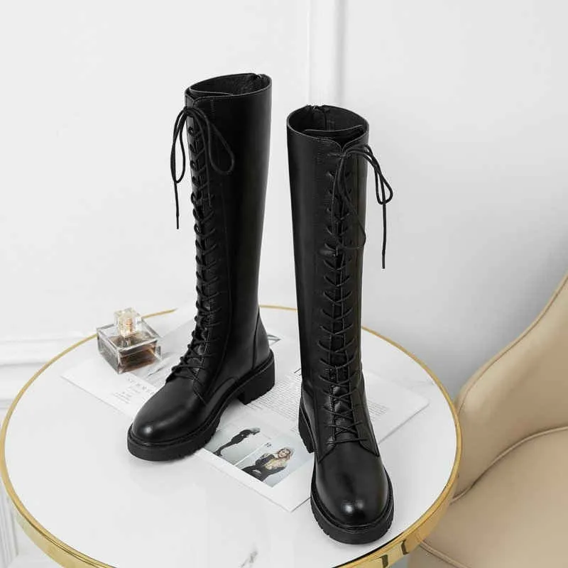 Женские сапоги до колена с плюшевой подкладкой, черные кожаные боев...