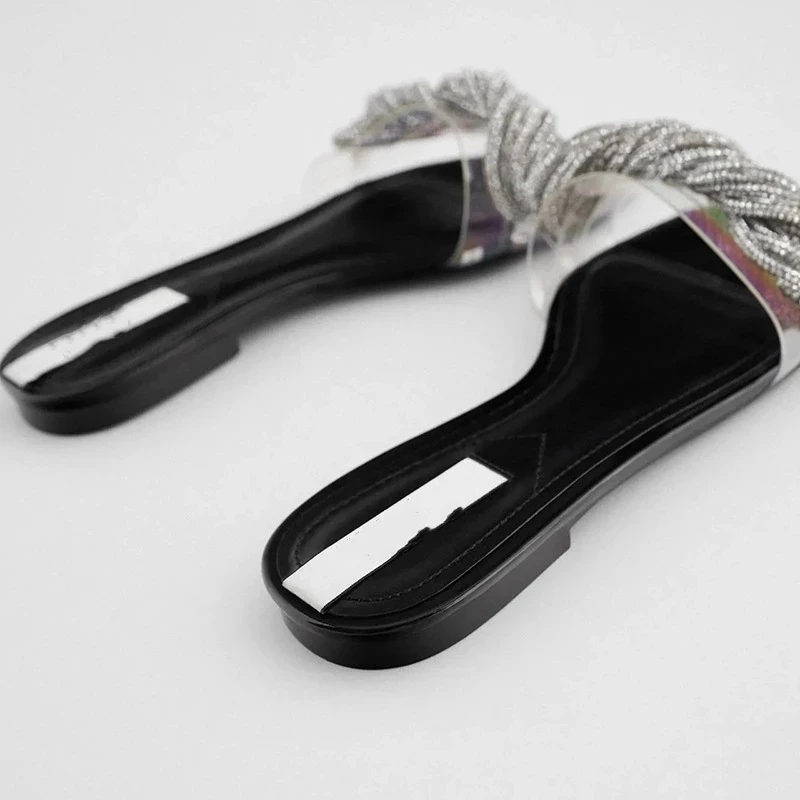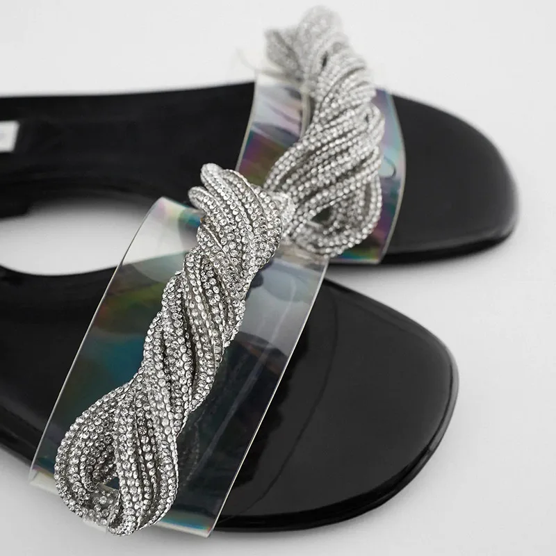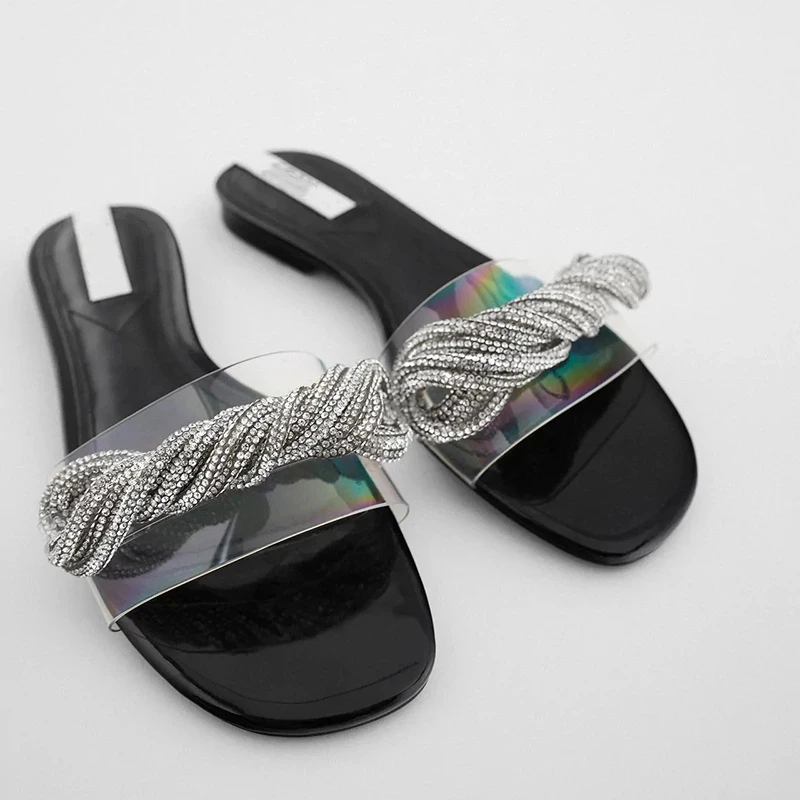 Женские сандалии со стразами ZARZ, пляжные босоножки на плоской подошве с квадратным носком и прозрачными стразами, весна-лето 2022