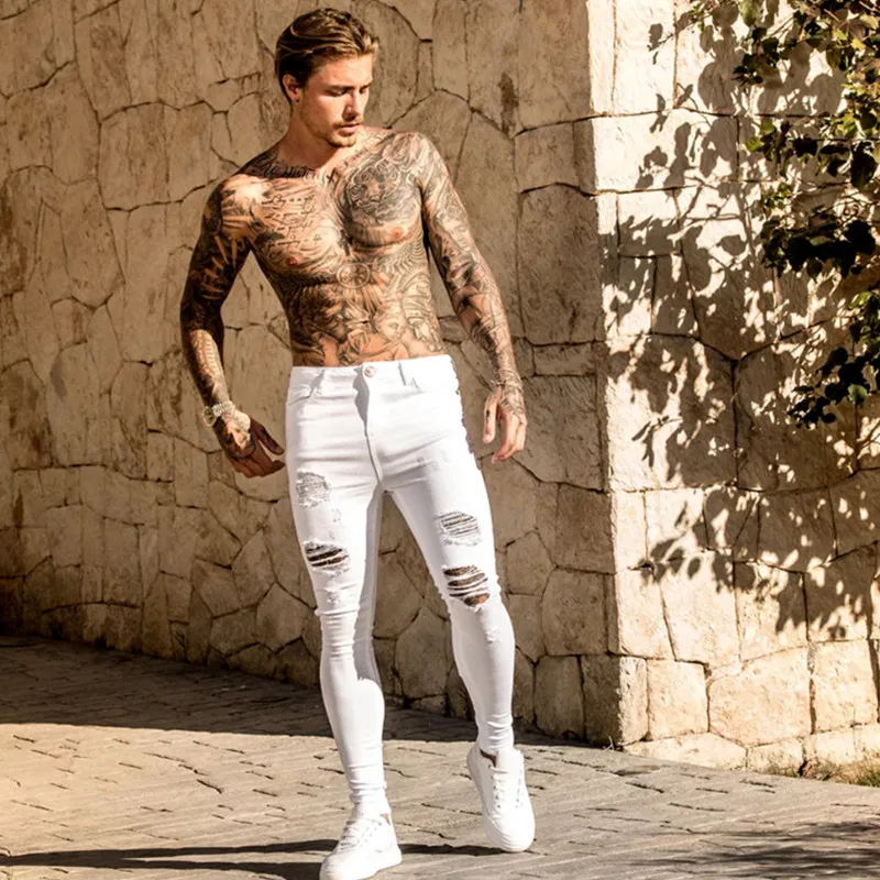 2021 Для мужчин обтягивающие джинсы с дырками Повседневное джинсовые брюки Узкие тонкие однотонные хлопковые стрейч человек искусственно состаренные джинсы Большие Размеры S-4XL