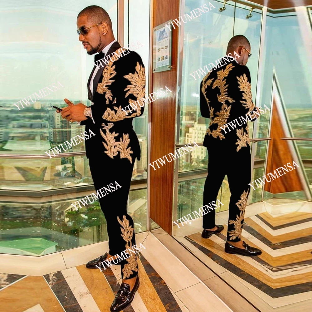Мужской пиджак с отложным воротником, черный пиджак с золотой вышивкой, деловые костюмы, свадебные блейзеры, однобортный пиджак и брюки, приталенный силуэт, 2 предмета