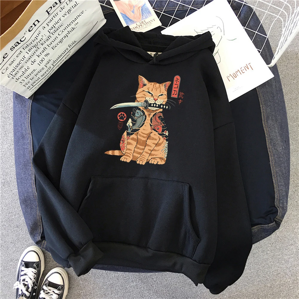 Толстовки с капюшоном с принтом кота из японского аниме, Женский флисовый винтажный Свободный пуловер с карманами в стиле хип-хоп, уличная одежда Харадзюку большого размера