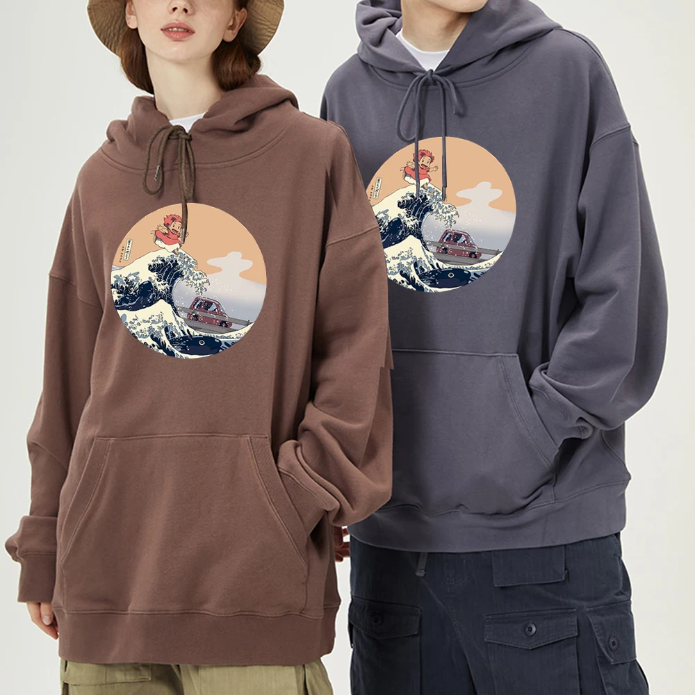 Толстовка Мужскаяженская с мультяшным принтом Великая волна, повседневный Свободный свитшот в японском стиле Харадзюку, флисовый пуловер с капюшоном и длинным рукавом
