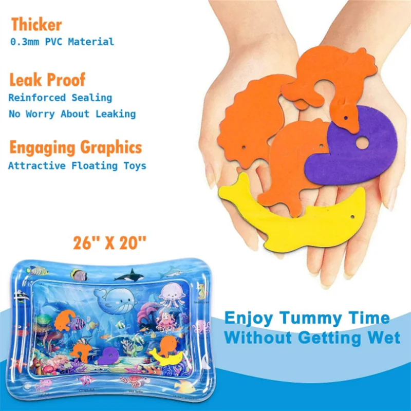 1. Сенсорная стимуляция для ребенка во время игры. Дайте ребенку немного времени на животик, пока они развлекаются с нашим надувным ковриком для водной активности. Педиатры настоятельно рекомендуют размещать детей на своих манекенах, потому что это помогает укрепить мышцы ног и рук, чтобы подготовить их к ползанию. Игрушки для животика-это Забавный способ помочь вашему ребенку достичь своих вех развития.