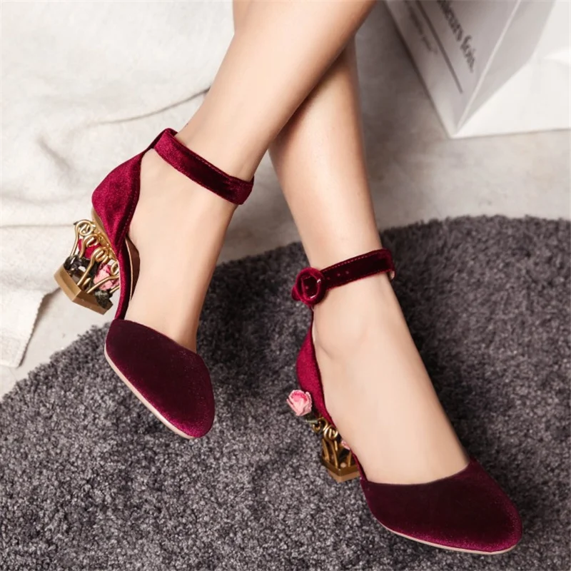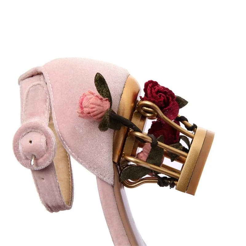 Сандалии женские с металлической пряжкой, босоножки на высоком каблуке, с круглым носком, бархатные, стразы в ретро стиле, с цветами, лето