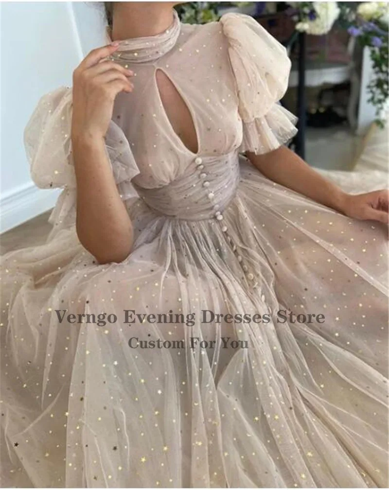 Вечернее платье из бледного фатина со звездами Verngo, с высоким воротом и короткими пышными рукавами, длиной до щиколотки, официальное платье, скромные праздничные платья для матери