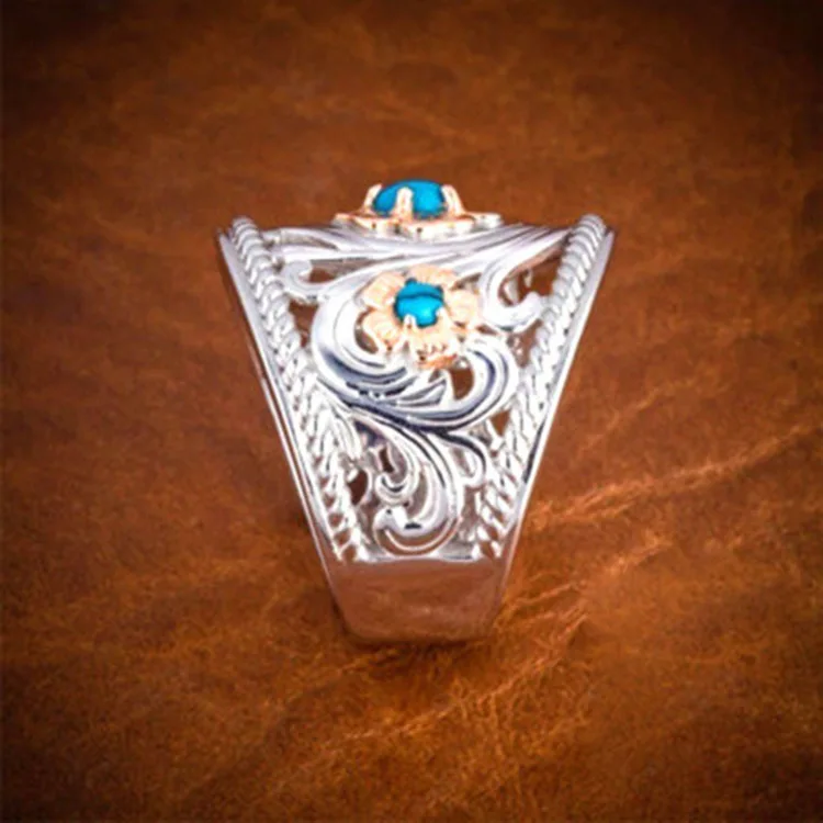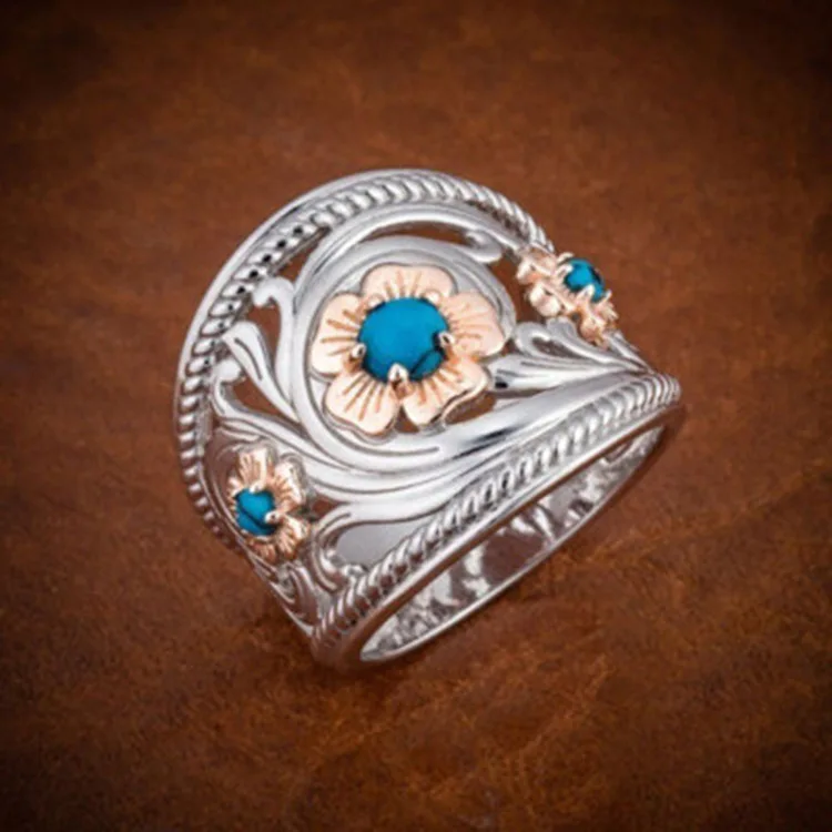 Роскошные Посеребренная полые розы, цветы из натурального камня кольцо для мужчин Синий Бирюзовый бисер, обручальные кольца для женщин, вечерние, ювелирное изделие, подарок