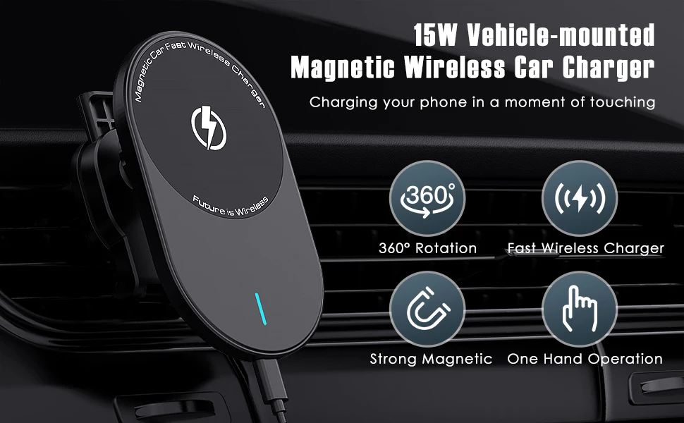 Что в коробке:1 × 15 Вт магнитное беспроводное автомобильное зарядное устройство, 1 × USB C кабель, 1 × руководство пользователя