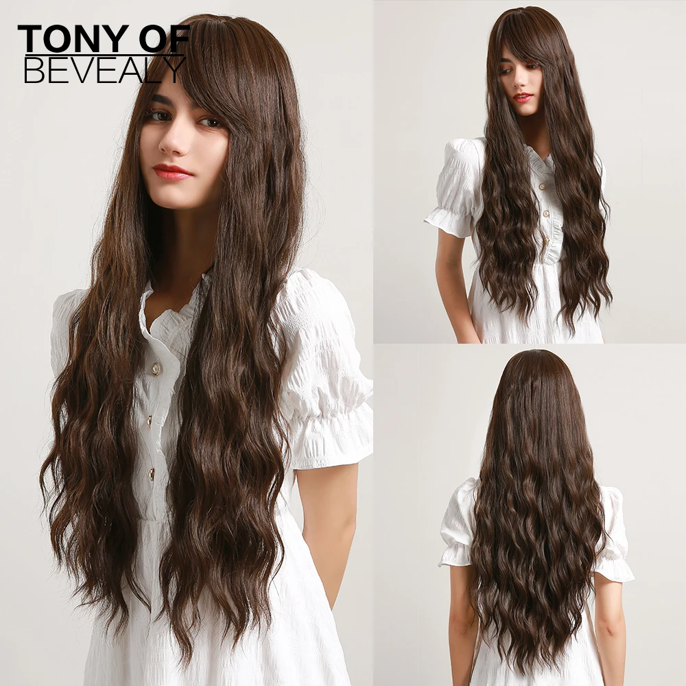 Длинные парики из искусственных волос с волнистыми волнами красного и коричневого цвета с челкой для афро женщин, повседневные парики для косплея из натуральных волос, термостойкие волокна