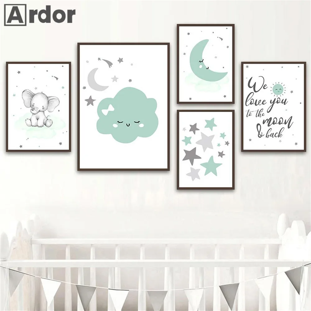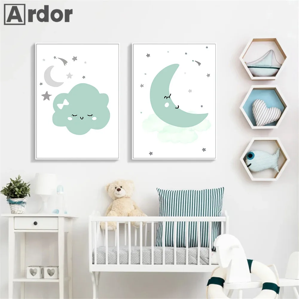 Настенная картина для детской комнаты, постер на холсте с изображением звезд, солнца, зеленых облаков, Луны, скандинавских цветов, декор для детской комнаты