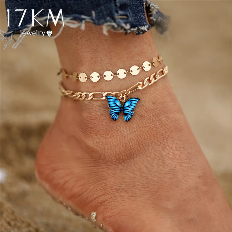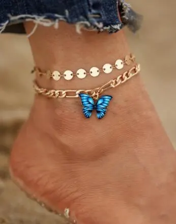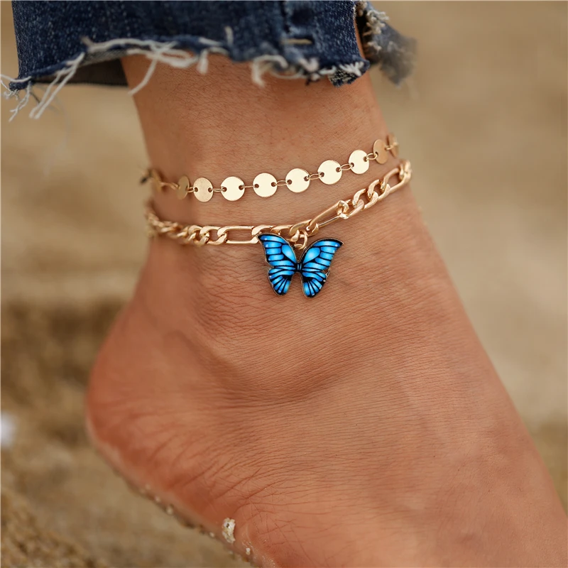 Браслет на лодыжку Женский, многослойный, летний, с голубой бабочкой, 17 км