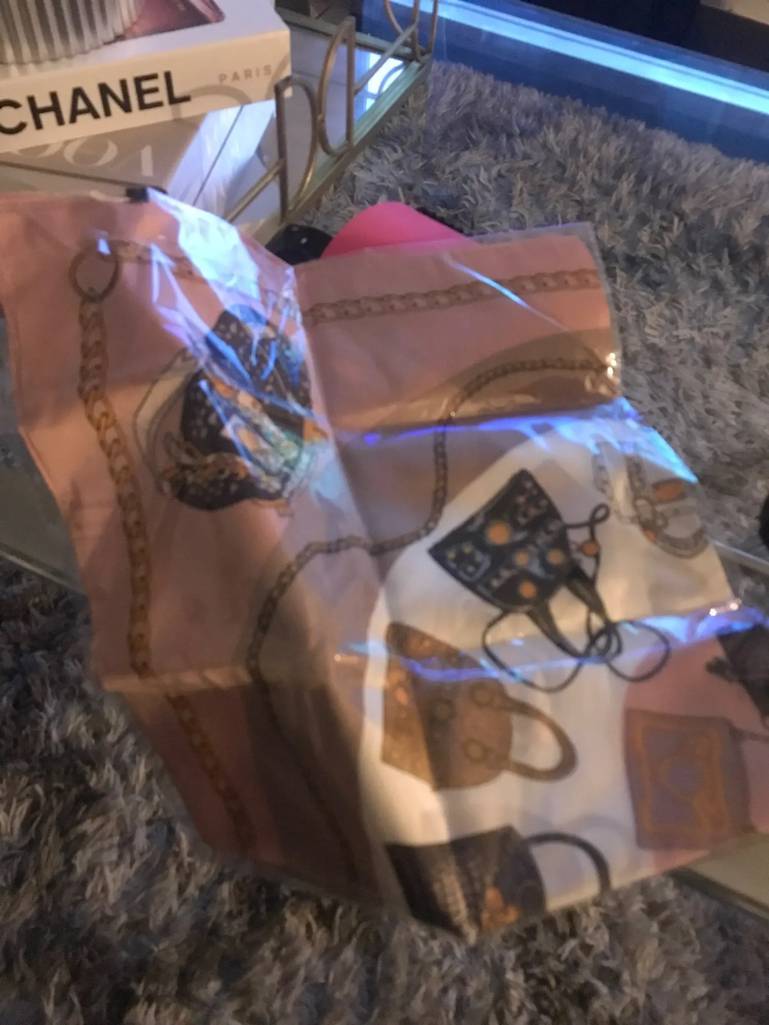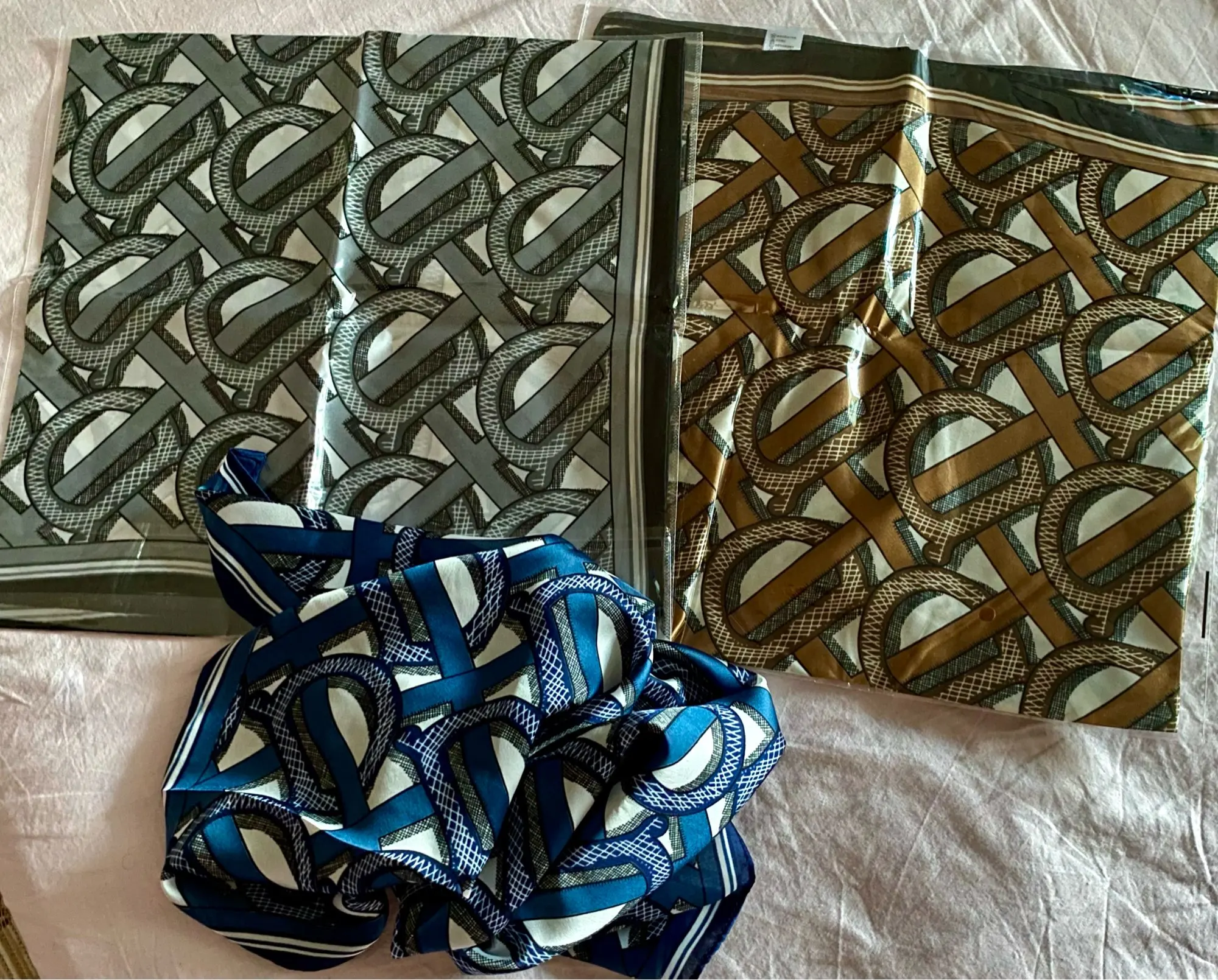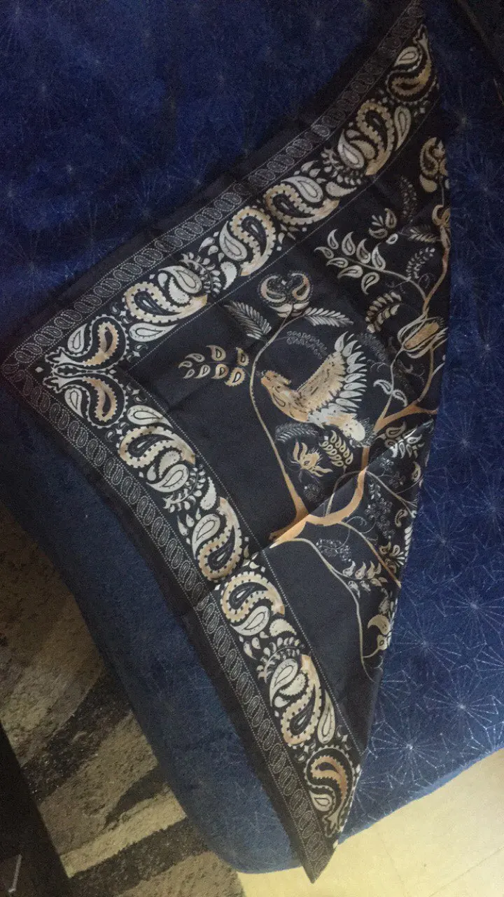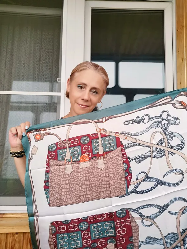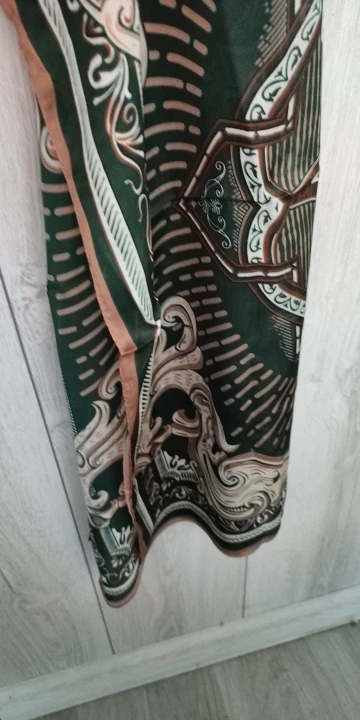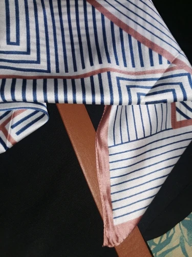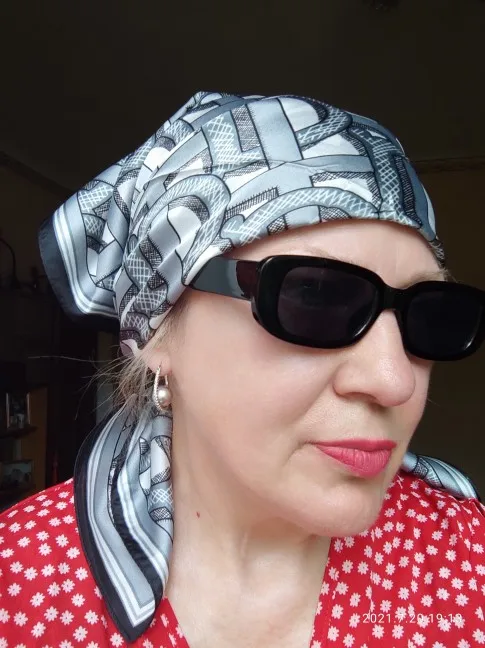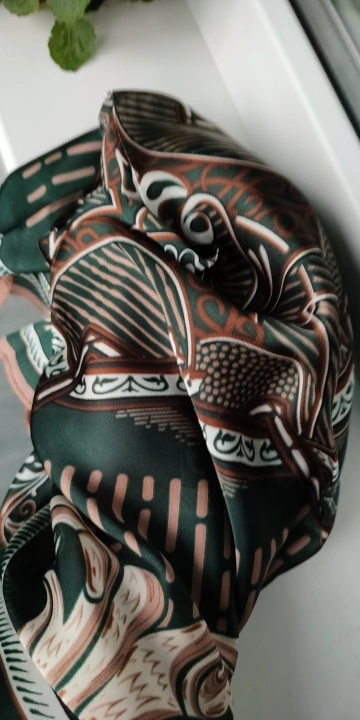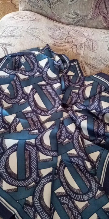 Шейный платок шёл немного меньше месяца. Получила на почте в одном пакете с другим товаром. Полиэстер. Краски яркие. Купила за 137 рублей. Конечно за эти деньги очень даже неплохо. Покупала, чтобы носить на зелёной сумке как аксессуар, но можно и на шее.