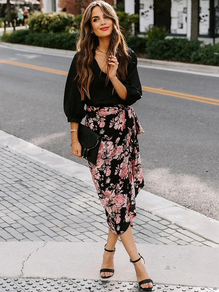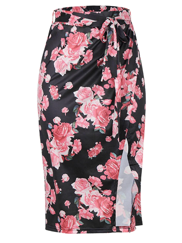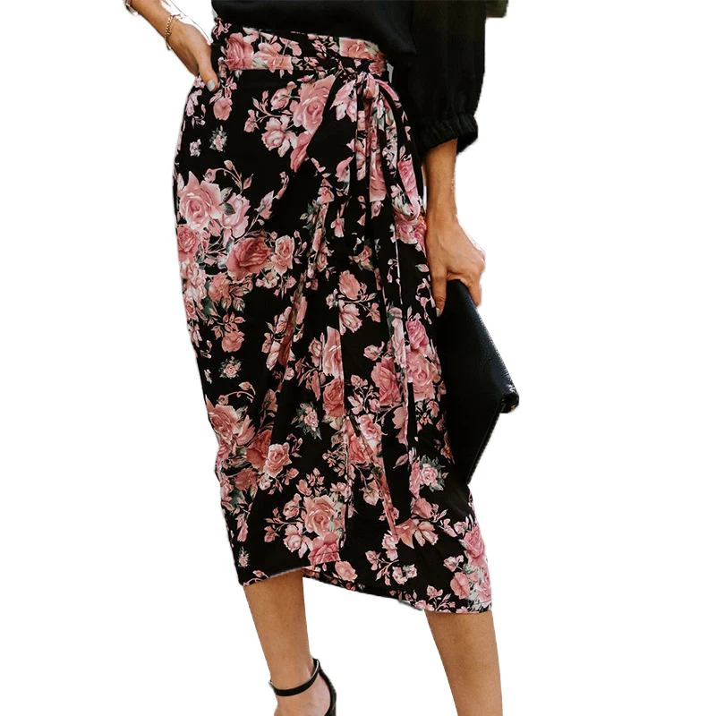 Офисные женские туфли трапециевидная юбка женская летняя обувь Цветочный принт с высокой талией повязки Асимметричная Повседневная одежда размера плюс уличная юбка