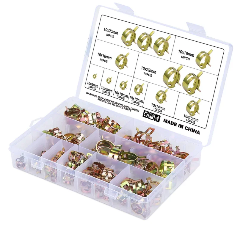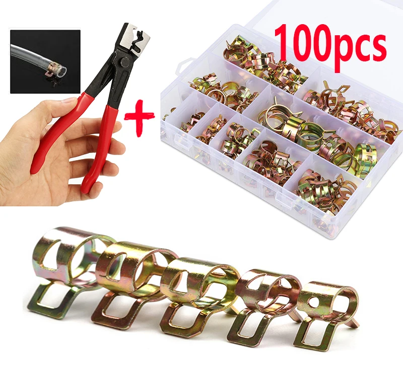 100 шт. x Пружинные хомуты с коробкой +1 шт. хомут для шланга