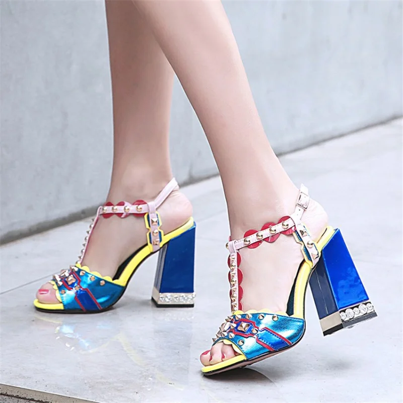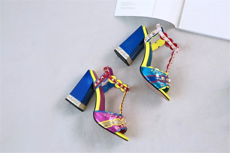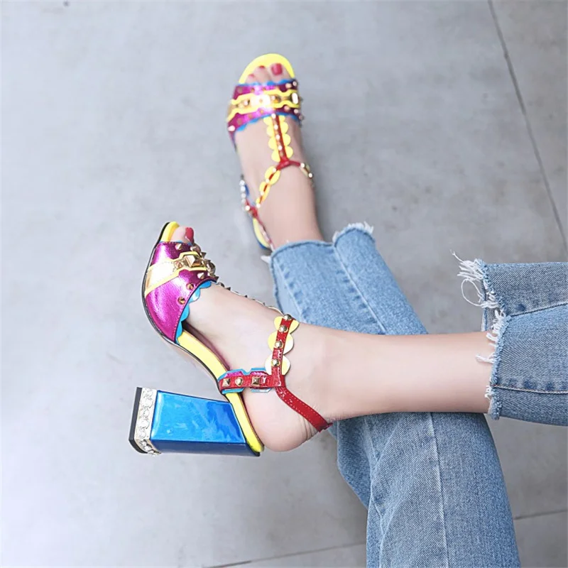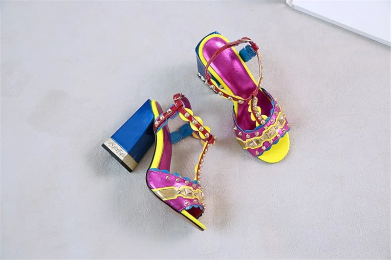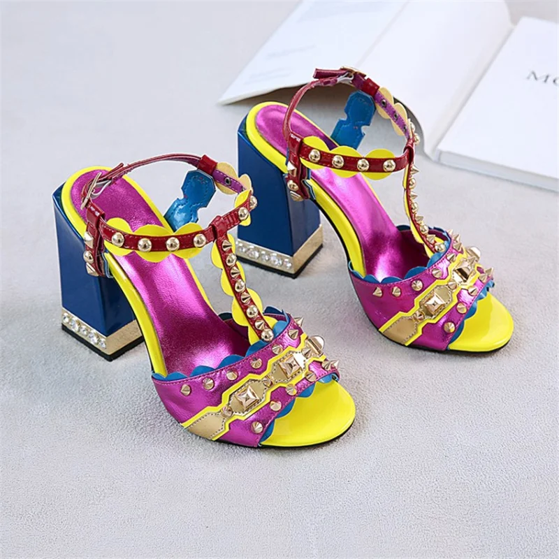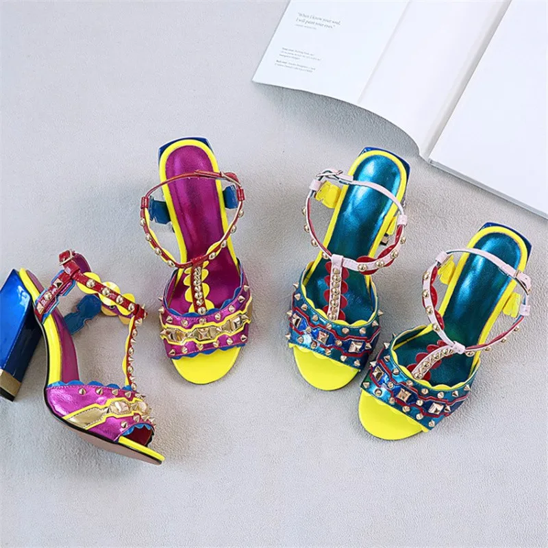 Женские сандалии с пряжкой, в стиле ретро, с заклепками, Т-образный открытый носок, на толстом каблуке, женские туфли, летние, с открытым носком, разноцветные