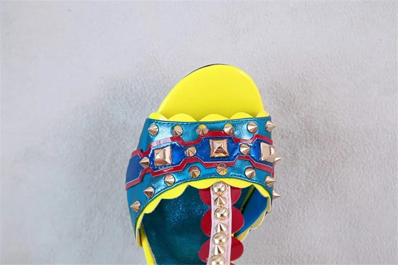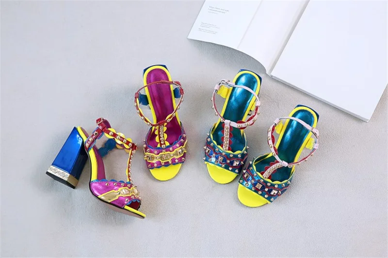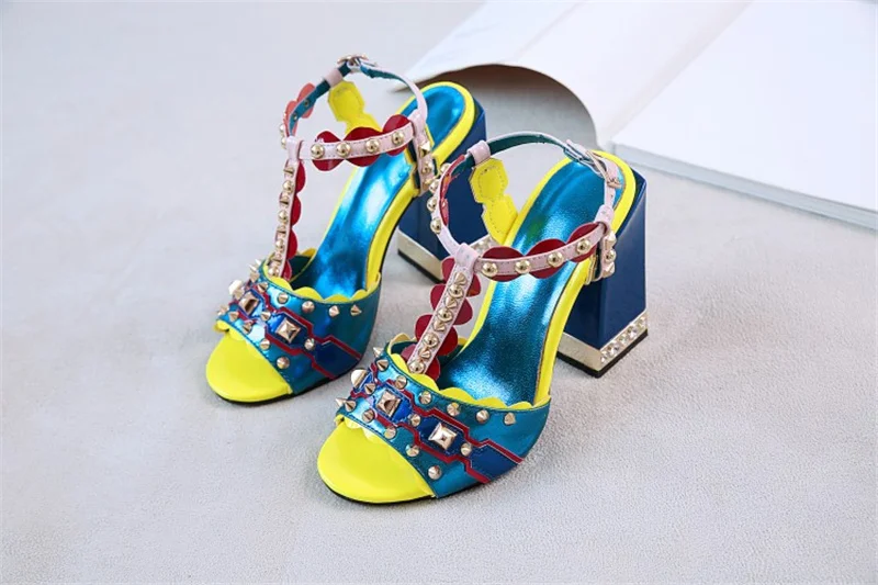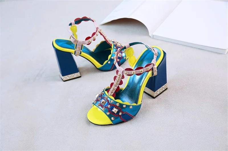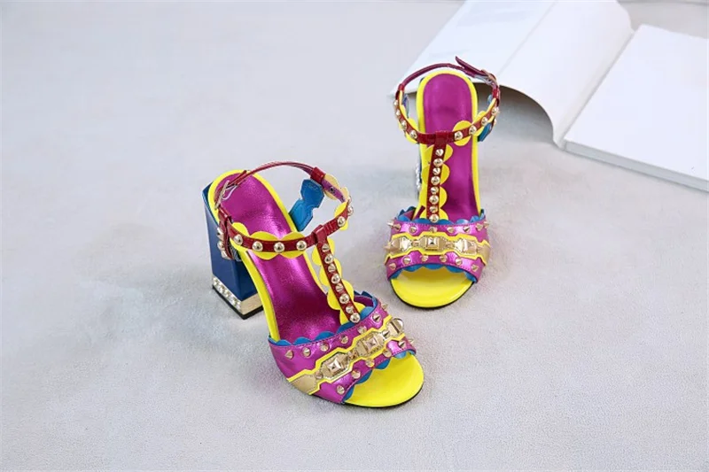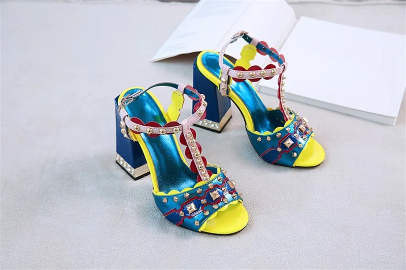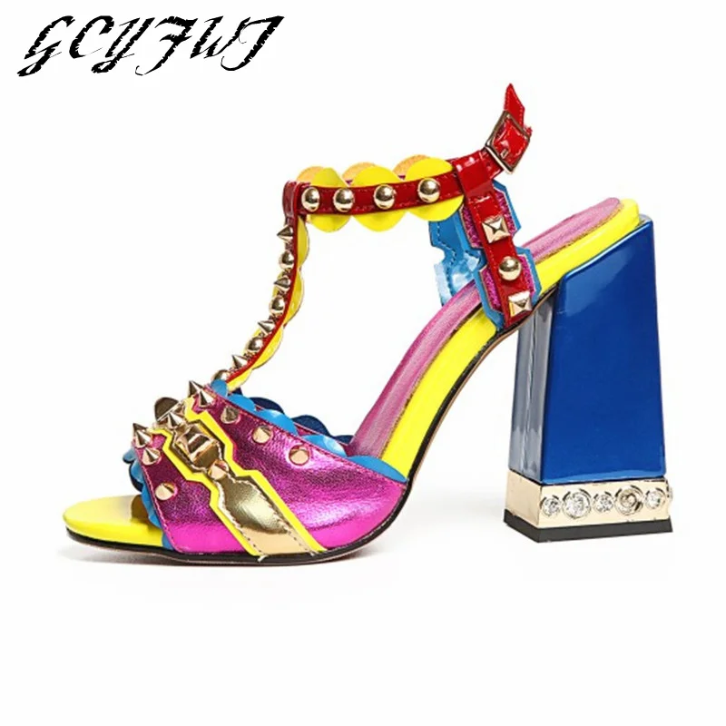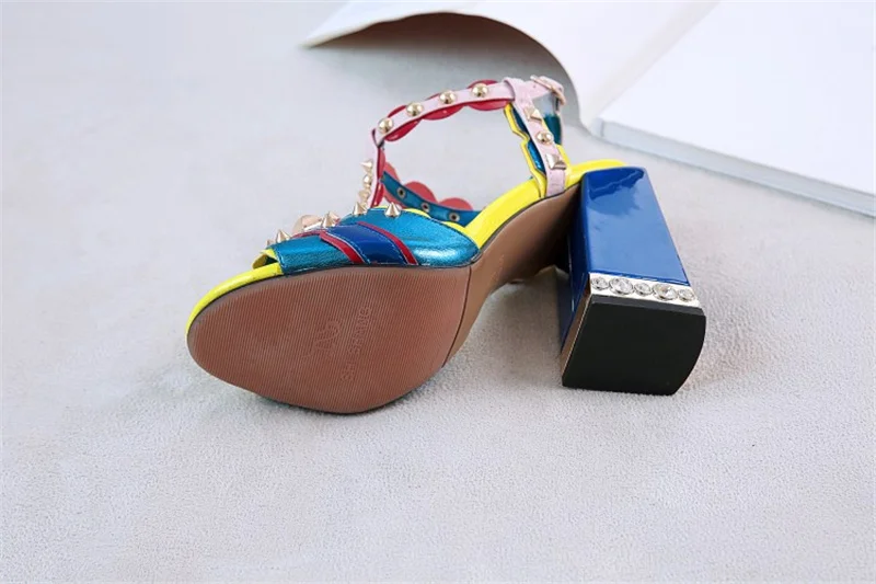 Женские сандалии с пряжкой, в стиле ретро, с заклепками, Т-образный открытый носок, на толстом каблуке, женские туфли, летние, с открытым носком, разноцветные