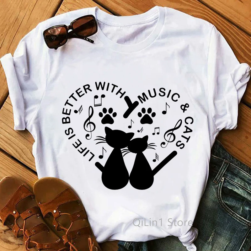 Новинка, Забавные футболки с принтом музыкальных нот с черной кошко...