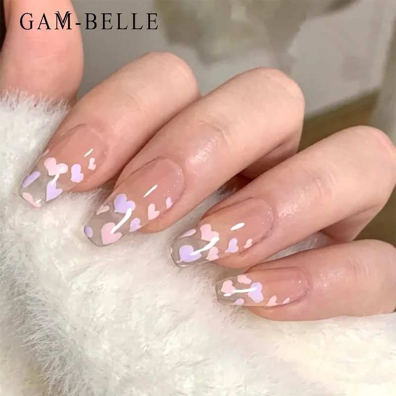 GAM-BELLE простые прозрачные накладные ногти с фиолетовым узором в виде сердца французский дизайн балерины искусственный пресс на ногти инструмент для маникюра