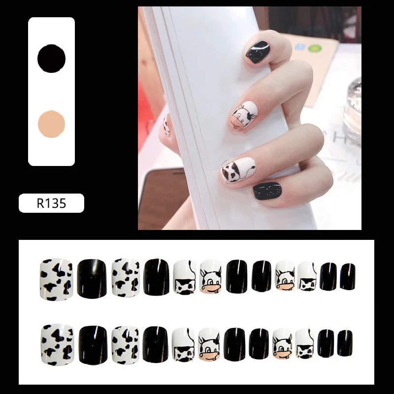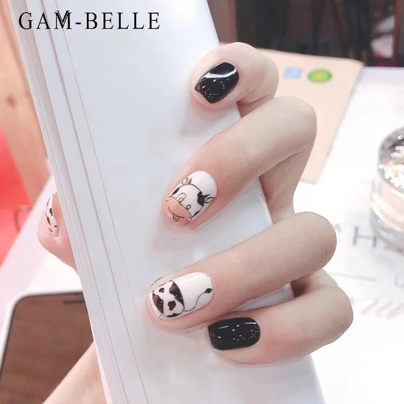 Гам-BELLE 24 шт. мультфильм корова серии накладные ногти черный, белый цвет французские квадратные искусственные нажмите на накладные ногти декоративный для маникюра DIY