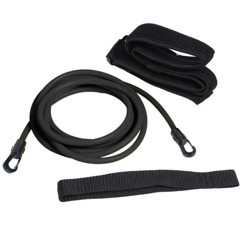 4. Небольшой ремешок черный и используется для фиксации эластичной веревки на берегу бассейна. Пловцы используют эластичность и сопротивление упругой веревки для упражнений.