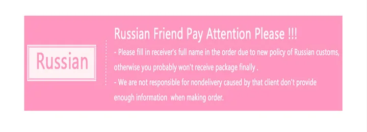 Русский друг, пожалуйста, обратите внимание!Пожалуйста, заполните полное имя получателя (включая 3 слова) в связи с новой политикой российской таможни,Предоставьте достаточно информации при оформлении заказа.1. Для того, чтобы сэкономить стоимость доставки для наших клиентов, мы отправим товары с бесплатной доставкой«Почта Китая обычный маленький пакет плюс», который нельзя отслеживать после того, как посылка покинула Китай. Однако это быстрее для многих стран.2. Мы не принимаем Никаких споров без номера отслеживания. Если вам нужно полное отслеживание, пожалуйста, выберите«Почта Китая заказной авиапочтой» или другой службой экспресс-доставки, но это увеличит стоимость доставки. Спасибо за понимание.3. Обычное время перевозки требуется от 25 до 60 дней, если ваше время подтверждения приближается, вы все еще не получили товар, пожалуйста, не открывайте спор, пожалуйста, свяжитесь с нами! Мы продлим дату доставки или отправим вам новую посылка.4. Если вы продливаете срок доставки, вы все еще не получили товар, пожалуйста, свяжитесь с нами, чтобы решить проблему, мы дадим вам полный возврат средств.5. Если стекло разбивается, пожалуйста, сделайте фотографии для нас, мы отправим вам новый или вернем деньги.6. Дорогие друзья, если у вас есть какие-либо вопросы, пожалуйста, не стесняйтесь связаться с нами вместо подачи заявки на спор или оставить отрицательный отзывы! Давайте поддерживать хорошие деловые отношения.Спасибо за вашу поддержку и понимание, я желаю вам приятных покупок!