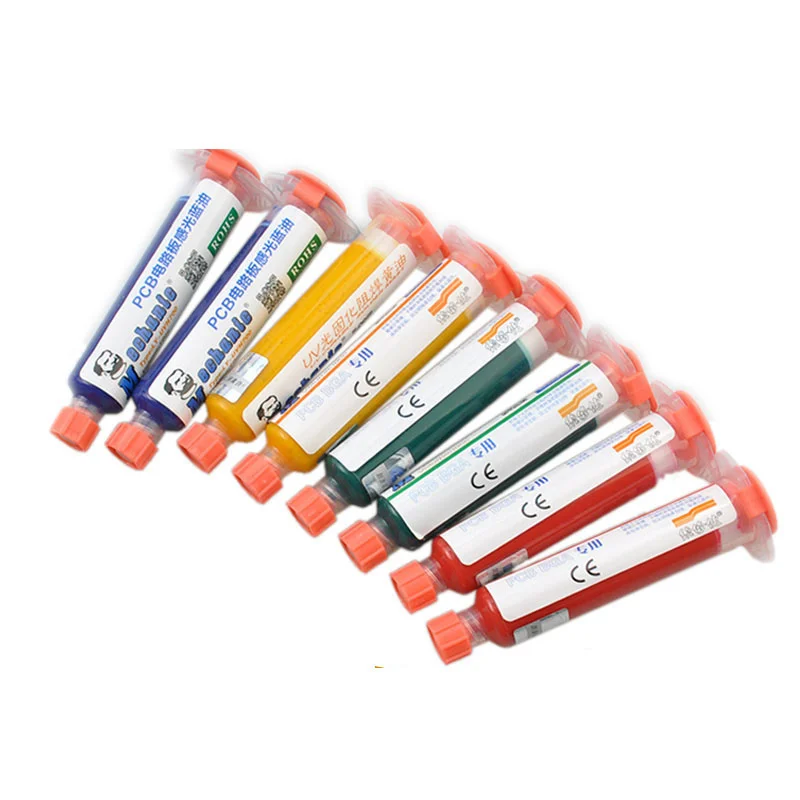 U светильник чувствительный Зеленый масло желтое масло быстрое лечение красный pcb плата сварочной цепи сопротивление Защитная краска изоляция Шесть цветов: зеленый, синий, черный, белый, красный, желтый. Длина шприца: апрокс. 10CC Материал: рисунок Нанесите немного краски на ваш компьютер. Нанесите его на pwb с крышкой прозрачной маски. Нанесите его под УФ (или солнце) светильник в течение нескольких минут. Вымойте дополнительную краску для бензина или растворителя на масляной основе. Инструкции: Применяется для ремонта телефона или компьютера, когда pwb линия неисправна, сначала используйте эмалированный провод для сварки летящего провода, затем Нанесите слой зеленого масла. Положите его на несколько часов под солнцем. По возможности, облученный в течение нескольких минут под ультрафиолетовым светильник, зеленое масло изменит и зафиксирует колодец в проводе и хороший эффект изоляции!