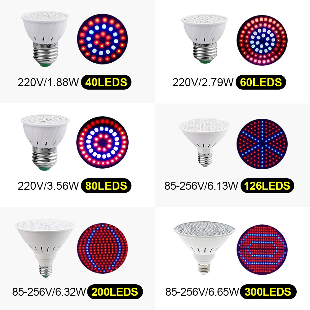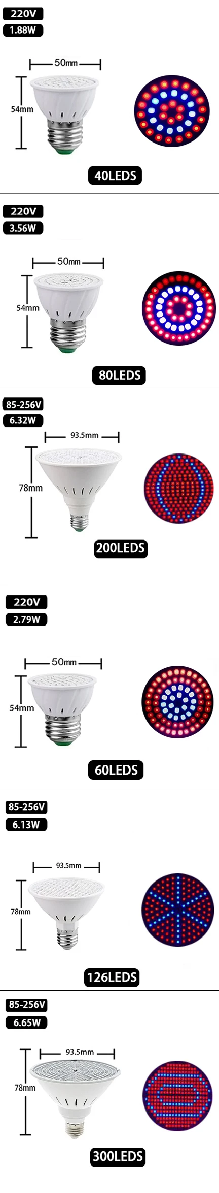 Товар: лампа для роста растенийСветодиодный чип: 2835 SMDСветодиодный Количество: 48/60/80/126/200/300 светодиодный sВходное напряжение: 100-240 В переменного токаСрок службы: 50000 часовТип цоколя: E27/E14/B22/GU10/MR16