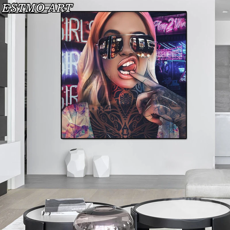 Плакаты и принты Картина на холсте женщина, с фиолетовыми неоновыми сексуальными татуировками, квадратные настенные картины, в скандинавском стиле, для девочек, для украшения спальни